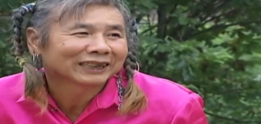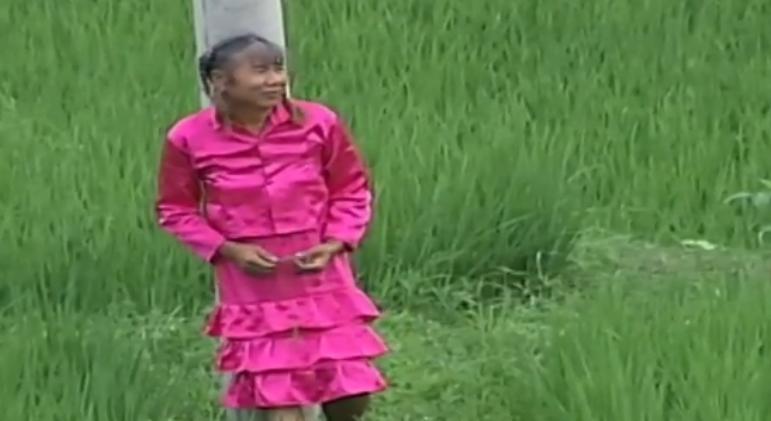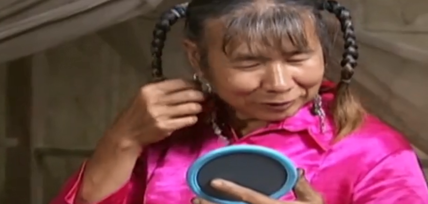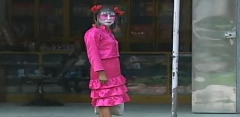 杨飞成整天浓妆艳抹、梳着两个麻花辫、穿着花裙子的样子,