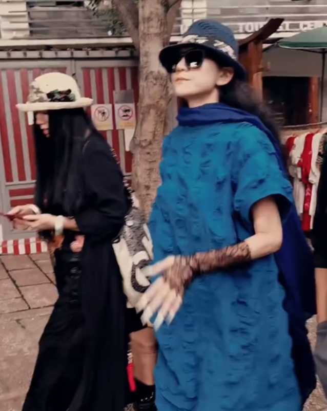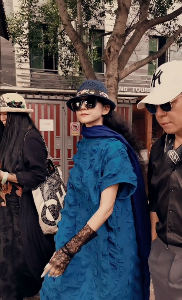 63岁的杨丽萍戴着墨镜,穿着蓝色长裙,常年学舞的她没有普通人的体态问题,在街道上走出了t台走秀的气势,通身气派非凡。