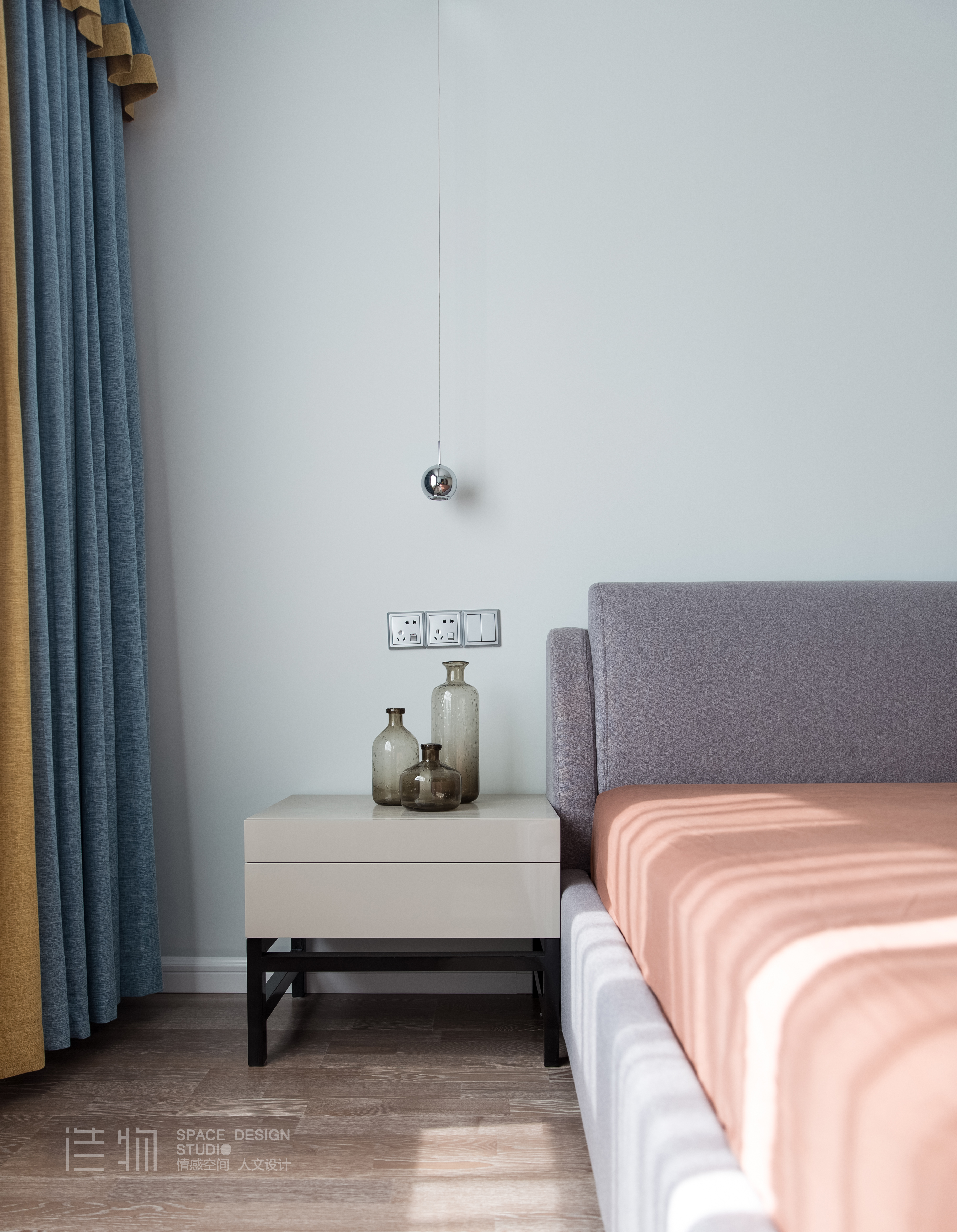 除了常规的衣柜和床,我们考虑在这个面积不小的卧室里放进一定的办公功能,床角处设置了一张桌台,兼具一定的女主人晨起化妆和办公写字的功能。越是小户型,越是能感受到设计师在其中细心的功能布置能力。