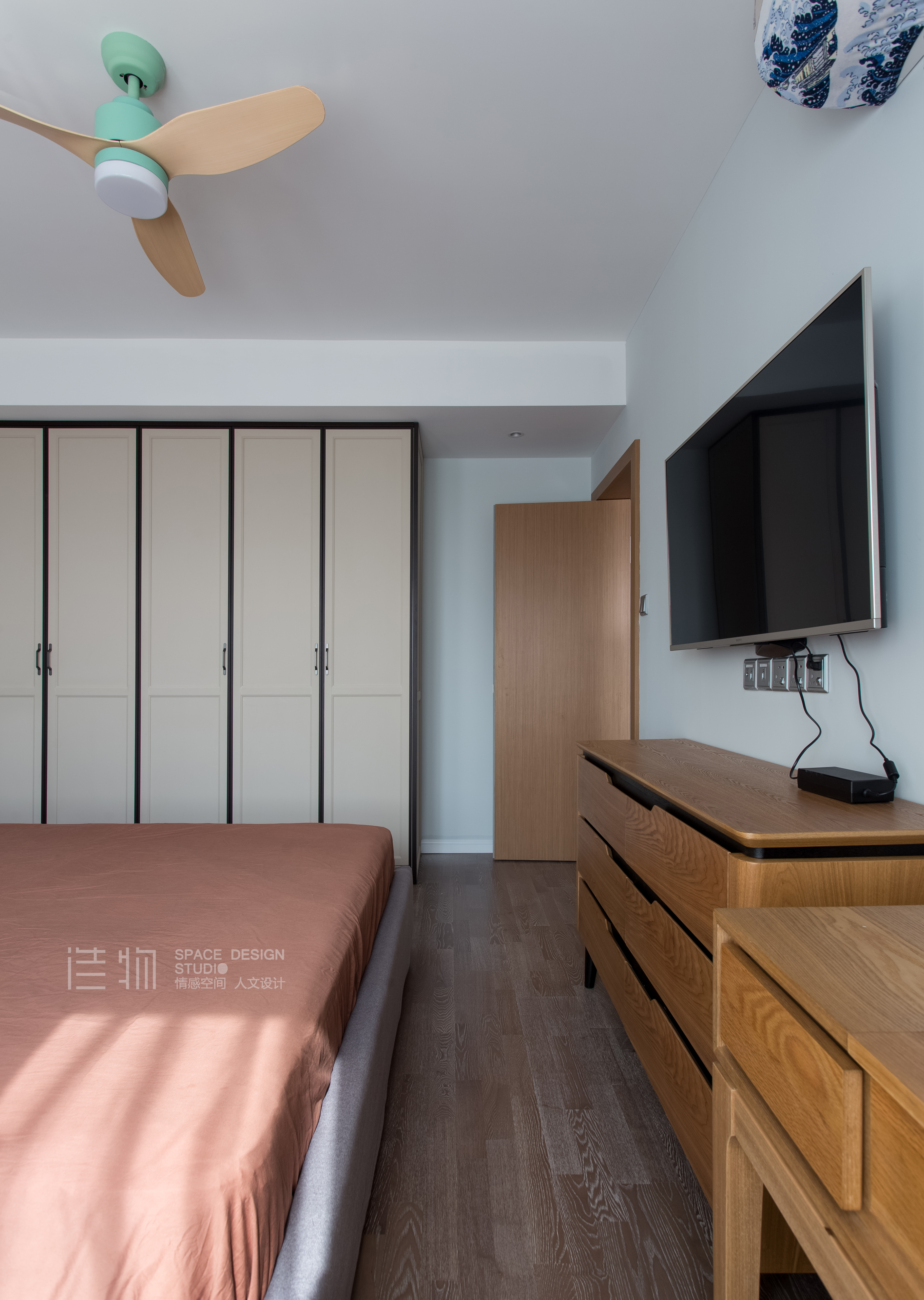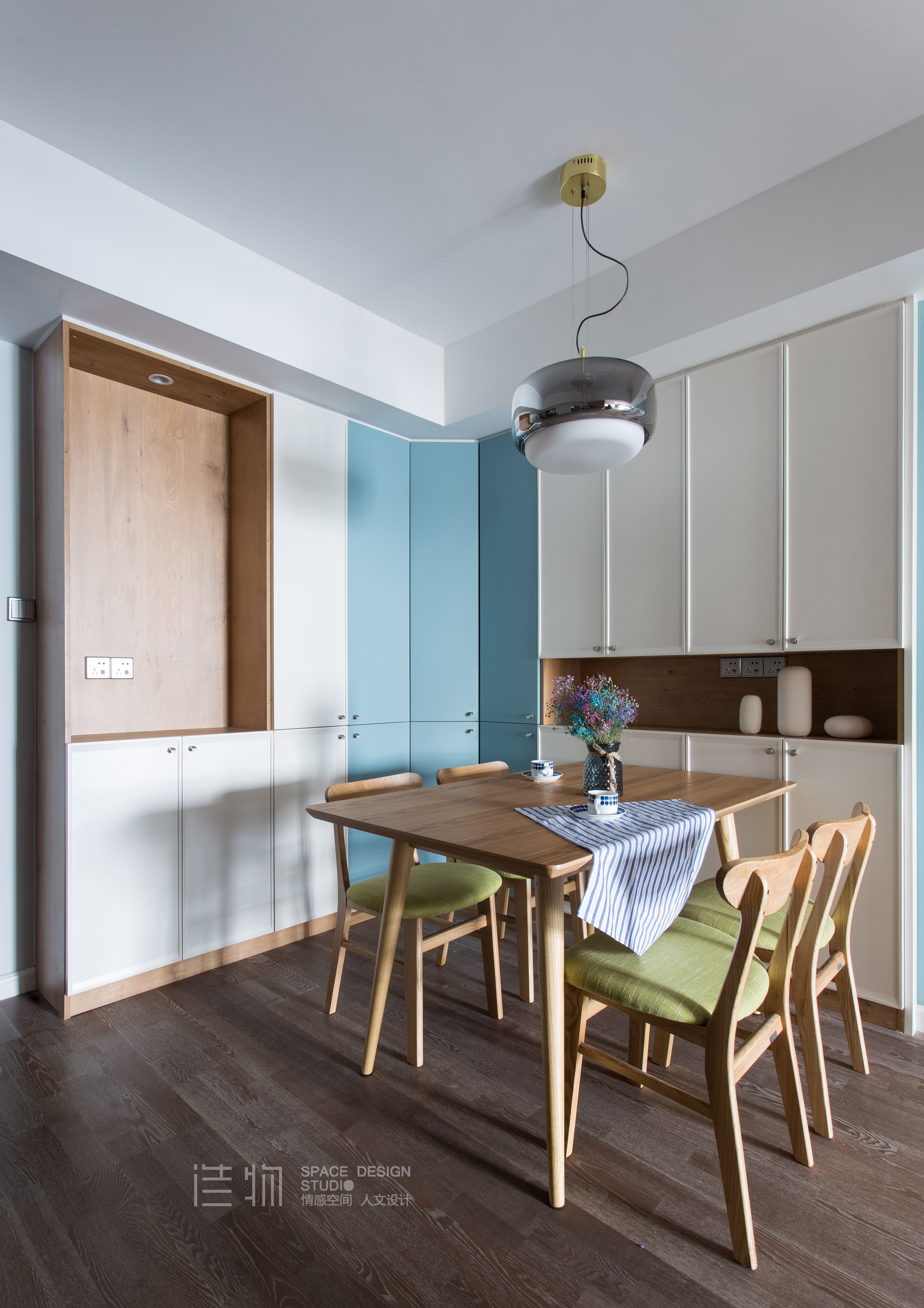 大片玻璃的移门的优点在餐厅也得到了体现,考虑到自然光在此处可以尽量反射,大面柜门我们使用了最干净的乳白色,在这个无法创建窗户的餐厅,也营造出了明快的感觉。用乳白不用纯白,是因为乳白偏暖更有温馨的感觉,符合这个屋子的整体调性,且伴随饱和度的提升在视觉质感上也更舒服,撞上一点水浅蓝,配套原木色的餐桌椅,与客厅的感觉呼应,处理成为一个利落的大空间