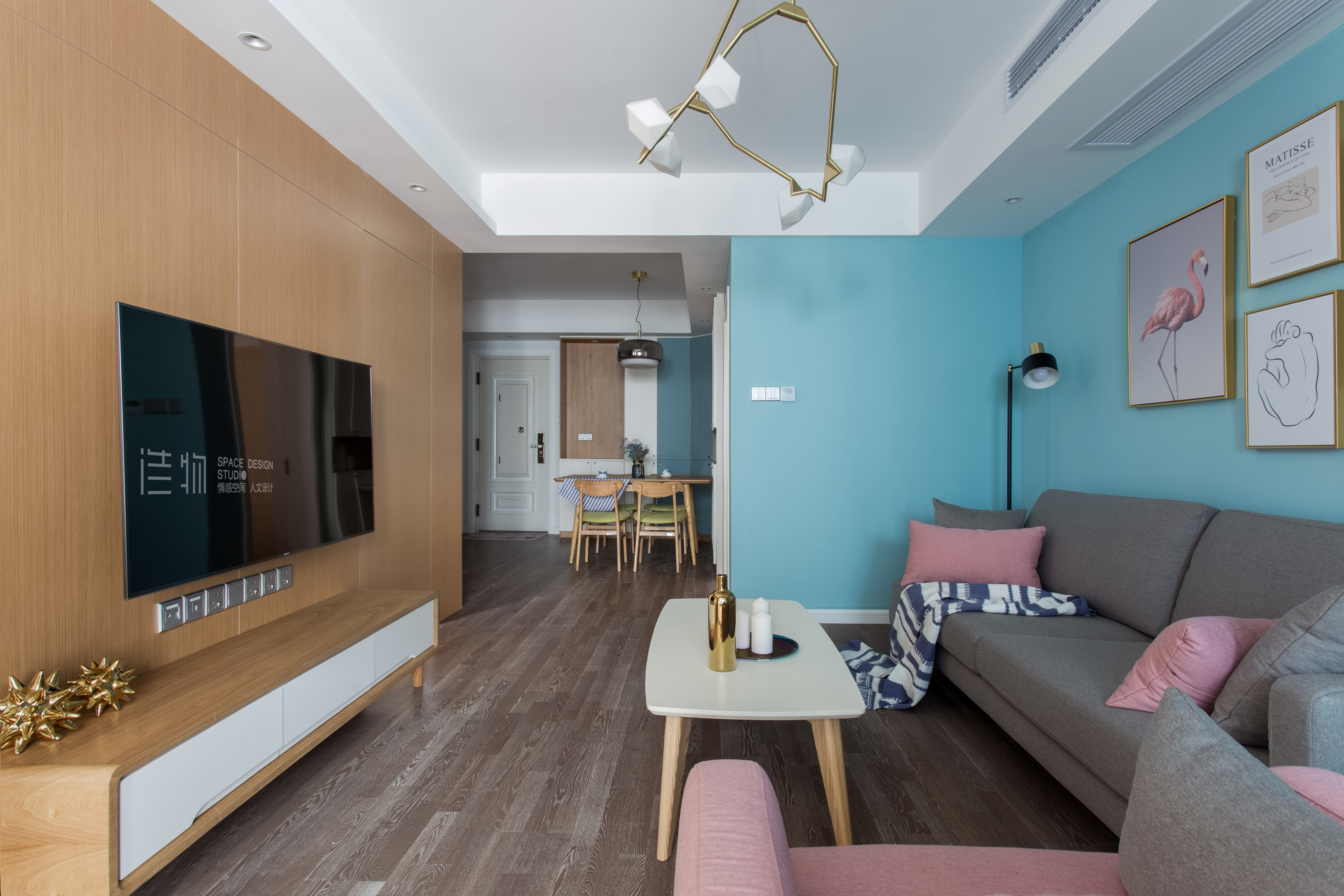 布艺灰调沙发,水浅蓝与pink在空间的撞色,还有经典的原木与白,明亮利落的北欧氛围跳脱而出,感受到屋主大女孩和小女孩满满的少女心~少量硬朗的细黑线条,收拾掉空间的色彩张力,让这小小的幸福满而不溢