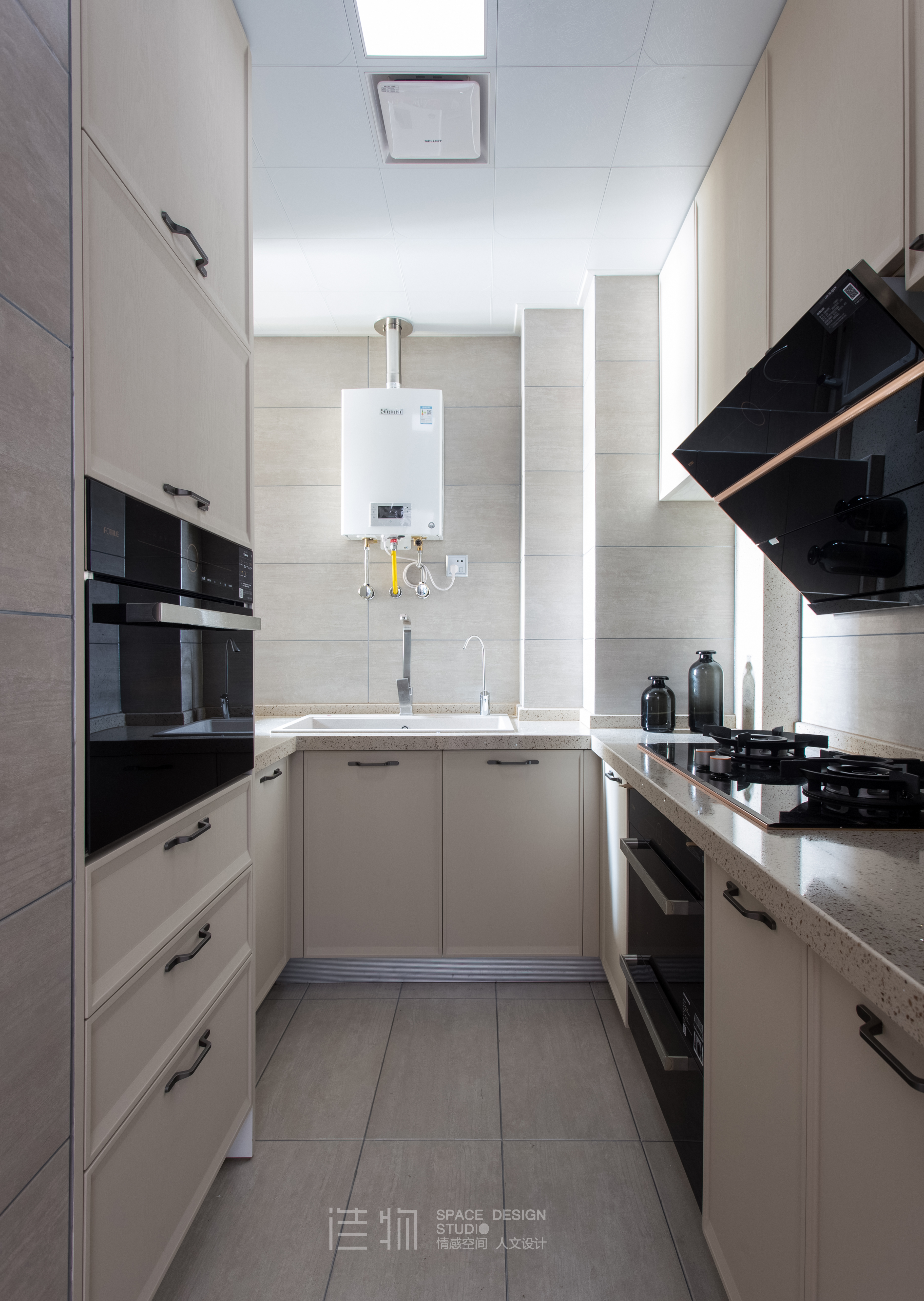 厨房收纳虽然解决了,但光线的流通是第二大问题。原本的厨房是昏暗的,只能借助灯光照明。我们利用了赠送的一片很小的外部台面,开窗让光线流入,让原本昏暗的厨房也有吧自然光的进入。解决了小户型的厨房功能,是对真正生活幸福感的巨大提升