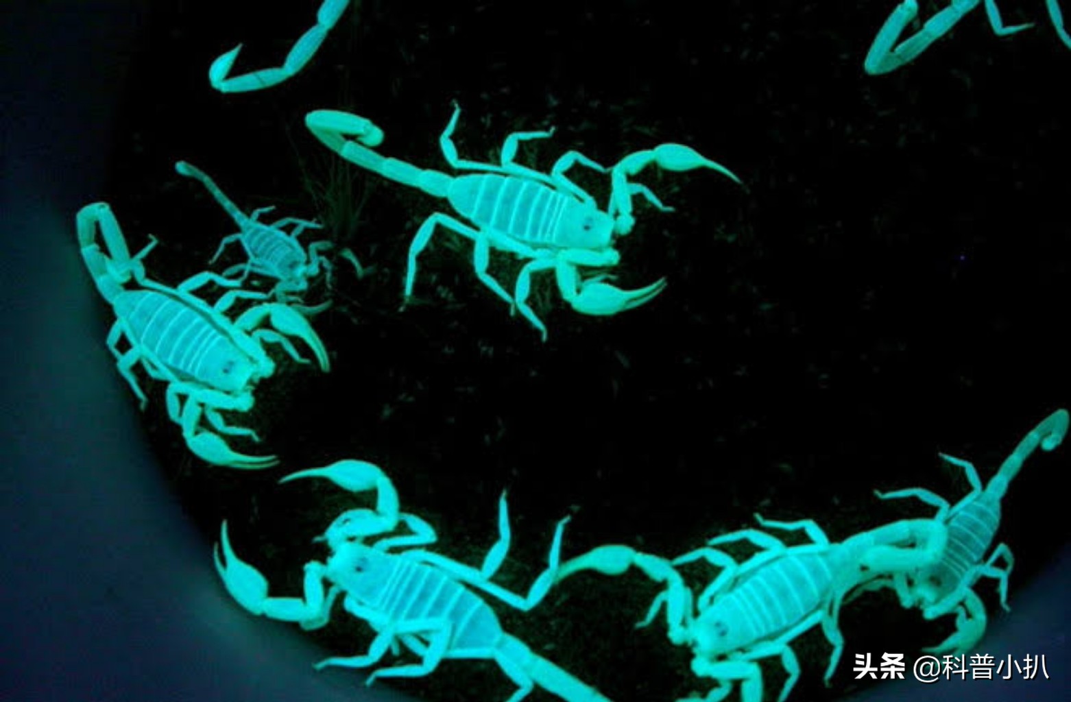 因为个体稍大的蝎子身上会有一种叫做β-咔啉的荧光物质,这些物质会随着骨片和角质层硬化而越发明显,也就是说个体越大的蝎子,其荧光色越明显,只要和紫外线接触,就能散发出蓝绿色的荧光。