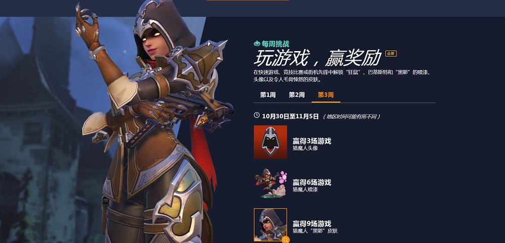 为什么把猎魔者作为万圣节每周挑战的最后奖励呢?我觉得这和黑影在之后对战中会有出色表现很有关系,在上次的媒体采访中jeff说道,想要获得冠军就去玩黑影吧,这并不是一句玩笑话,在ptr中铁拳遭到了微调,虽然削弱不算很明显但实力确实损失了,而铁拳的克星黑影在改动后针对性更强,版本之子铁拳有人制裁可以说是大快人心了,在这种情况下黑影的猎魔者能作为最后奖励不是没有道理的。这次万圣节活将从10月16号到11月5号持续三周,想要集齐皮肤的小伙伴们可以开始行动了,三周说长不长说短不短,但想要玩遍活动内容拿到一些皮肤还是绰绰有余的。