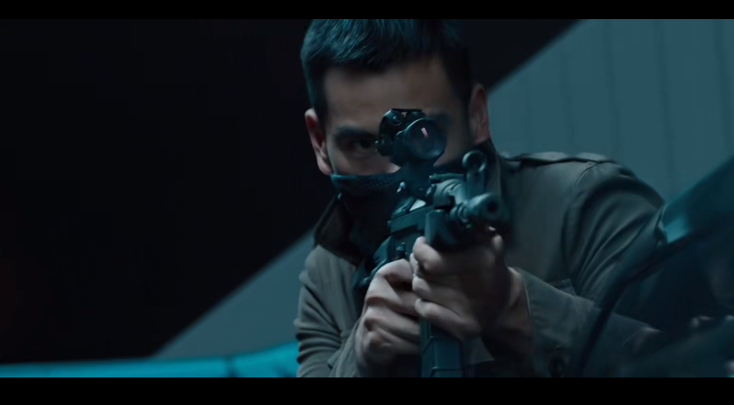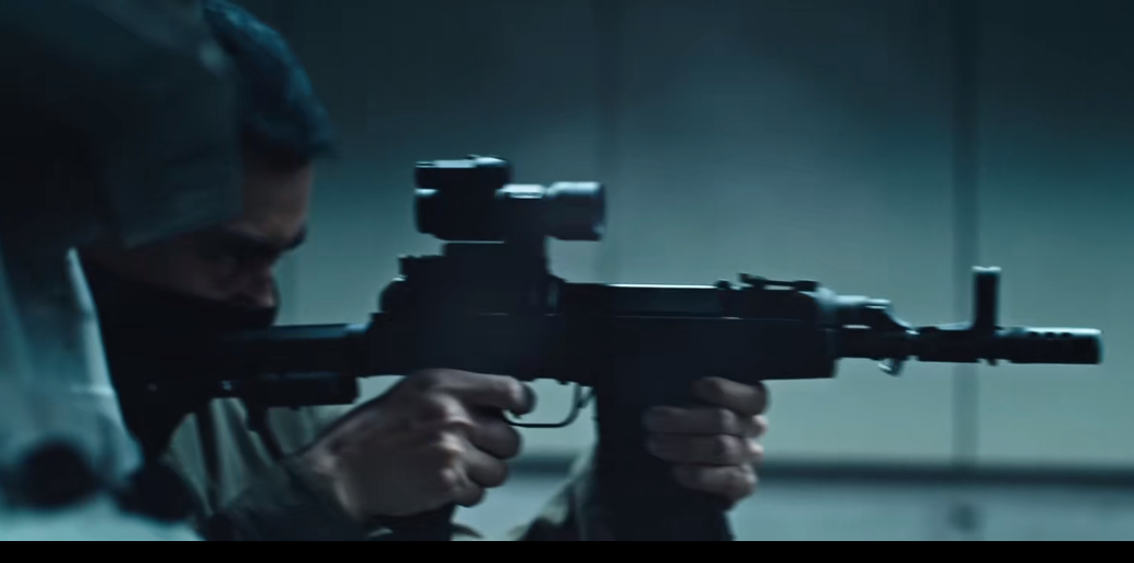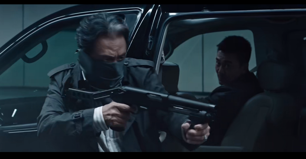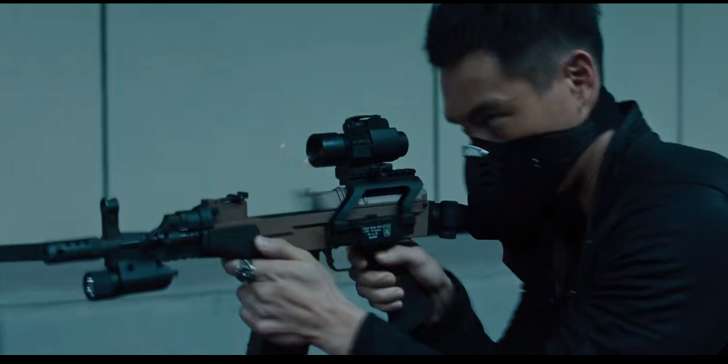 这里面刘杰辉正准备拔枪,李家俊突然从车中出来直接射击,这里使用的武器是短管vz58突击步枪。此枪正式名称为sa.vz 58 sporter compact, 意译为sa vz 58运动紧凑型突击步枪。此改型有5.56mm和7.62*39mm两种口径,电影里使用的是5.56mm版本,根据弹夹弯曲程度判断。李家俊的vz 58 使用了拉伸枪托,黑色cerakote ;杨佑宁饰演的何国正使用了折叠枪托,沙漠cerakote。两把枪都使用了csa的lpm 瞄具架,aimpoint compm2 红点瞄具。