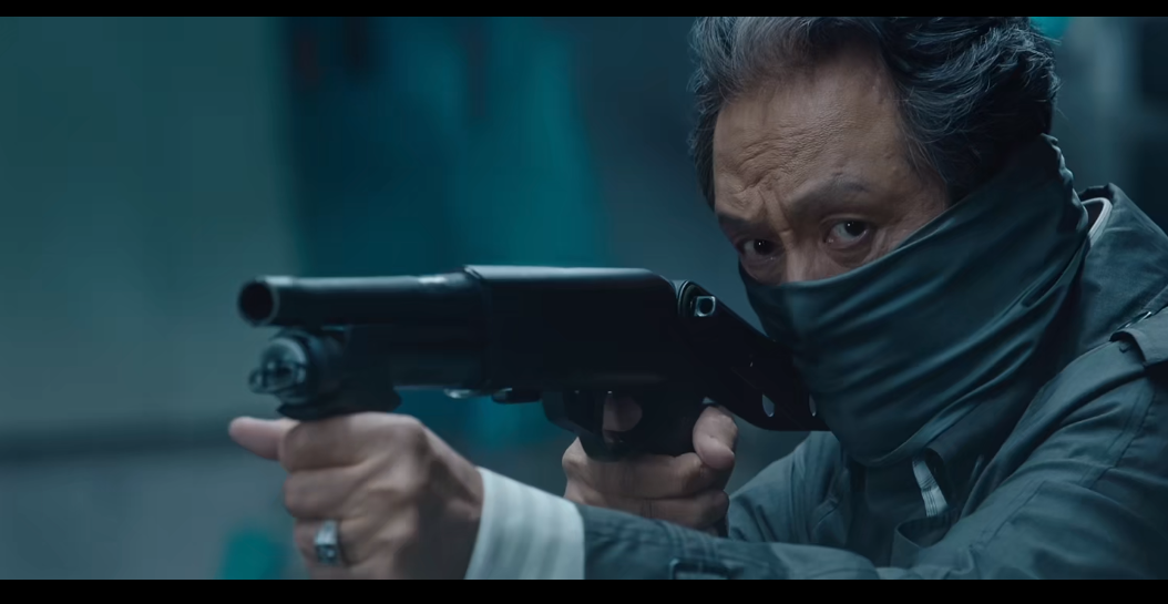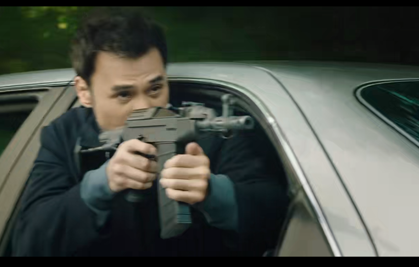 这里的匪徒带了面罩但是也能看出来是吴樾饰演的胡天闻,胡天闻曾是军警出身,所以使用一把军用武器也很符合他的身份。