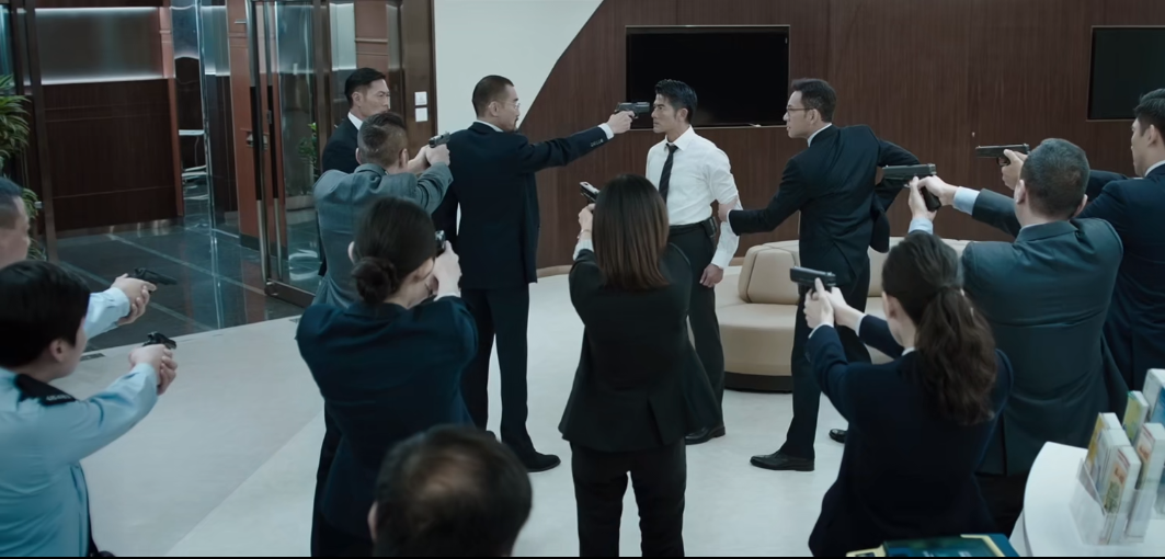 接下来就是总部纷争李文彬因为儿子被杀,直接拿枪顶着刘杰辉的头,看着自己老大这样,双方的部下也都持枪相向。前二当家抢现二当家配枪指着大当家。mb大叔拿的是之前说的sig p250紧凑型,后面的警员拿着众所周知的glock g17。 从配枪看等级。后面两名普通警员配备史密斯威森军警型号10转轮手枪,口径.38,第二层警员配备格洛克g17,中心高层配备sig p250互殴。