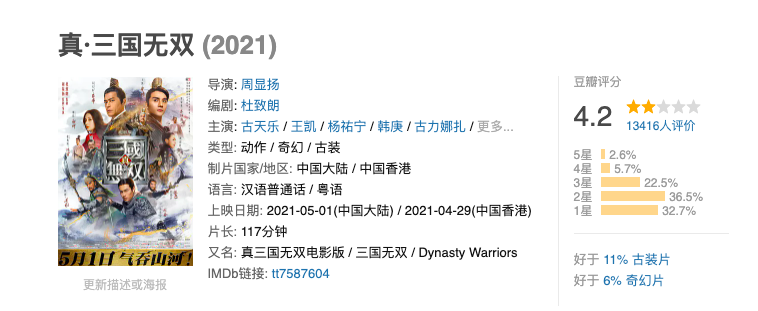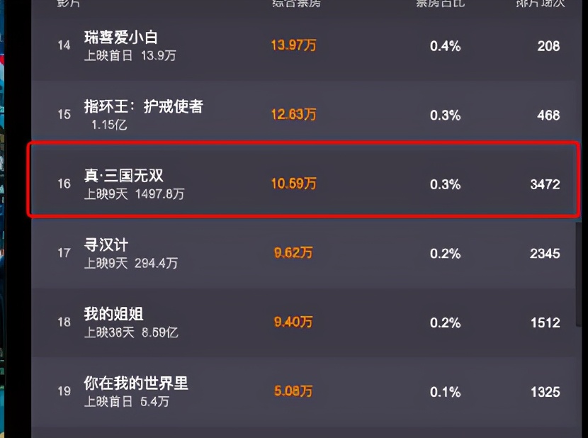 《追虎擒龙》收了1.94亿,而《真三国无双》截止到发稿时,只有1497万,算是扑街最惨的一部。