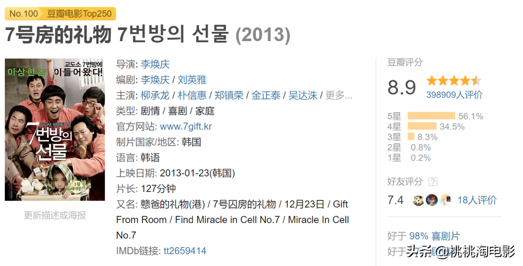 七年前,韩国电影《七号房的礼物》赚足眼泪,拿下韩国电影青龙奖最佳男主角、荣获百想艺术大赏最佳编剧和韩国电影大钟奖最佳男主角。在豆瓣上,这部电影有将近40万人打分,90%以上的观众给出了四星以上的评分。