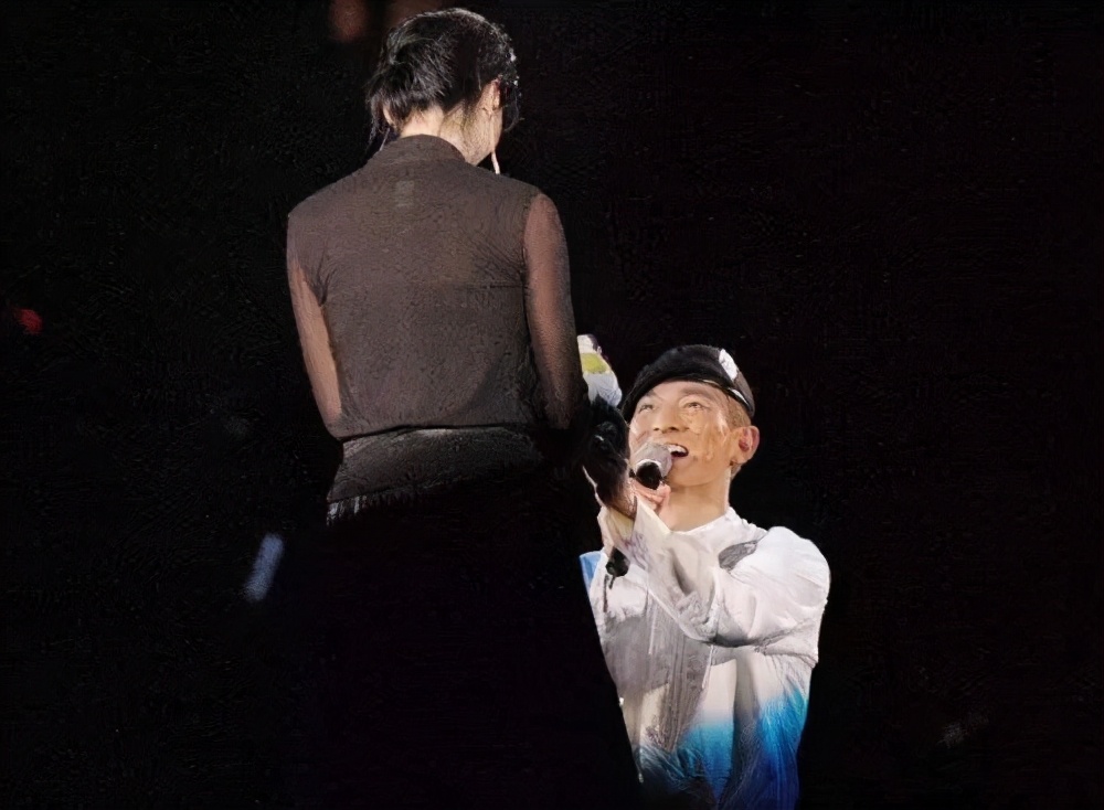 在舞台上,华仔单膝跪地,这个求婚的姿势当即引发了全场尖叫。