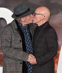 大家可能一眼看出来了,中间那个老头儿不就是《x战警》里面的x教授吗?没错,他就是老年x教授的饰演者著名演员帕特里克·斯图尔特(patrick stewart),而他同时也是《星际迷航》电视剧的第二部,1987年首播的《星际迷航:下一代》的男主角皮卡德船长的饰演者。而在最新播出的这部《星际迷航:皮卡德》里面,帕特里克·斯图尔特饰演的仍是皮卡德船长这一剧中人物。前阵子,《星际迷航:皮卡德》在伦敦举行首映礼,"万磁王"饰演者伊恩·麦克莱恩(ian mckellen)亲自到现场给老友帕特里克·斯图尔特捧场,并献上热吻。