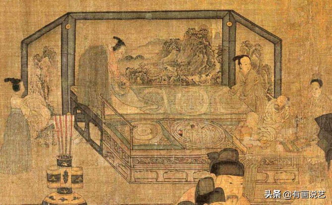 此画绘有“三重门”,一重为展开画卷所见的画面,二重为画卷内的屏风画,三重为屏风画内的屏风画(图四),画套屏风屏风套画,三重各画不同时空场景各自关联又各自独立,千年来独此一幅奇思妙想之作!