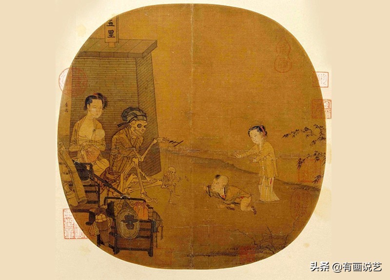 此画虽仅八百龄,却能独冠奇画之首,画中似乎有阴阳轮回之意:有妇人哺乳逗娃的天伦之乐、亦有骷髅戏子的鬼魅诱惑。