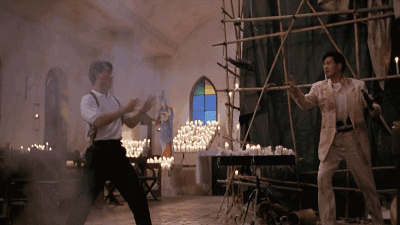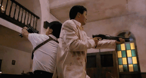 这部《喋血双雄》无疑是吴宇森、周润发、李修贤三位最强烈的一次化学反应,巅峰之作,没有之一,烛火通明的教堂、充满血腥的杀戮战场、枪林弹雨间飞翔的白鸽……统统都充满了暴力美学的浪漫气息,而周润发和李修贤在片中饰演的一警一匪、似友似敌的角色,更是至今让人津津乐道,两个男人飙起戏来简直养眼。