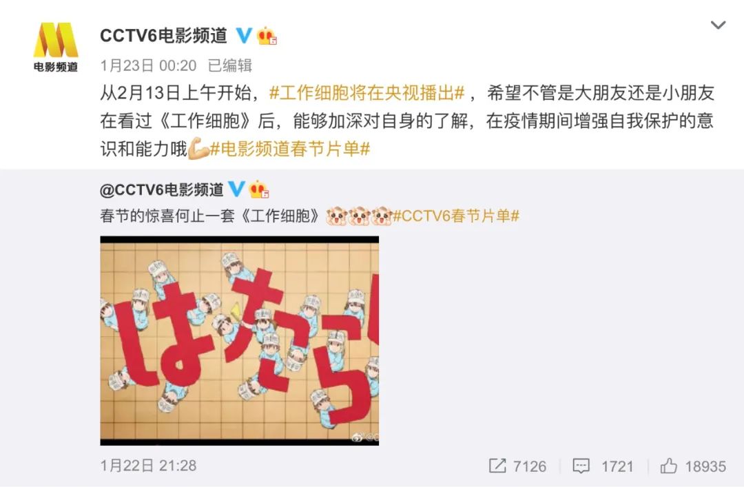 央视六公主把2018年播出的日本动画《工作细胞》的版权买了,农历新年正式播出。