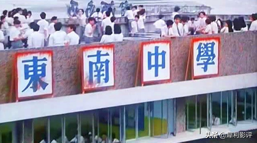 《学校风云》的剧情正如它的简介,是黑社会势力侵入校园后,发生一系列故事,片中的学校名叫“东南中学”,坐落在启德机场旁边,课间休息的几分钟,很多学生去楼顶抽烟,还能看到从头顶轰鸣而过的飞机,以及学校旁边的九龙城寨。