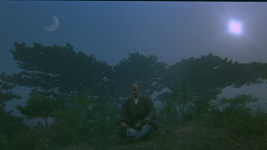 大只佬(了因和尚)在树下奋力挥棍乱舞,错手打死了一只小鸟,他很伤心,坐在树下七日七夜。