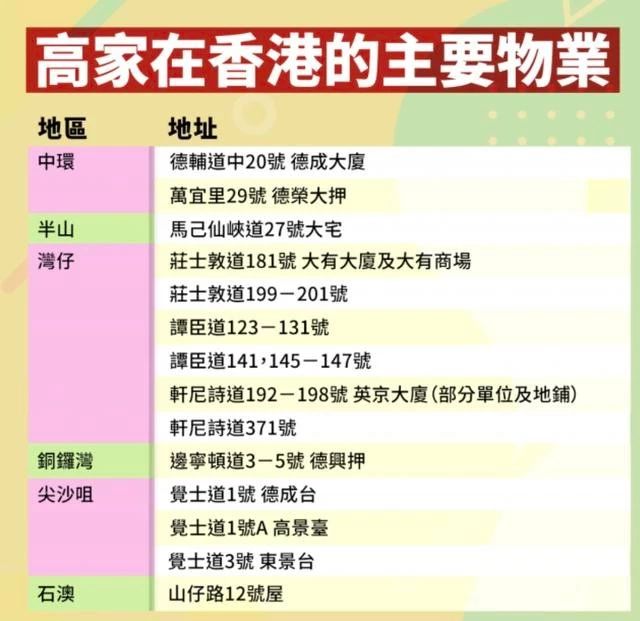 在高可宁去世后,高家产业被后来者穷追猛赶,发展势头不如当初,但目前高家在香港仍有十多处物业,估值约有300亿!