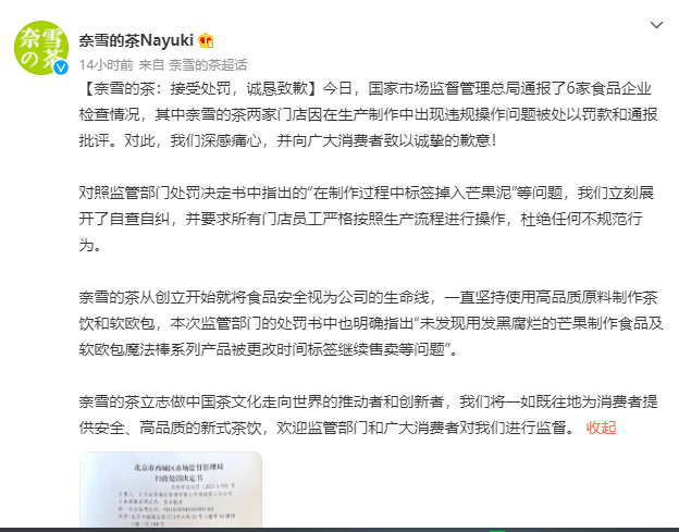 8月23日,市场监管总局公开6起食品安全案件查处情况。其中,拟对奈雪的茶(下称奈雪)2家涉事门店均给予顶格罚款10万元,对2家门店店长分别罚款25万元和罚款28万元。而在8月24日凌晨,奈雪对此事声明致歉,并承认自己的错误。