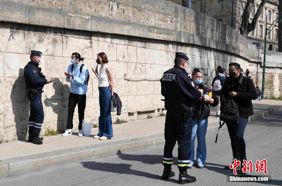 ▲法国警察在巴黎塞纳河沿岸对民众的出行证明等文件进行抽查。 中新社记者 李洋 摄