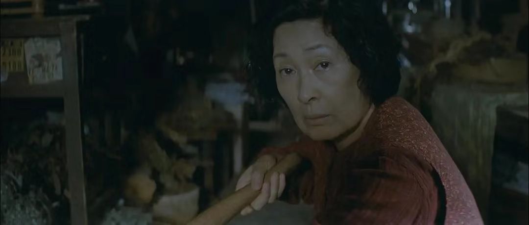 例如在正片的第一场中,母亲在店里切药材,但她的视线却始终停留在门外和朋友玩狗的智障儿子身上。