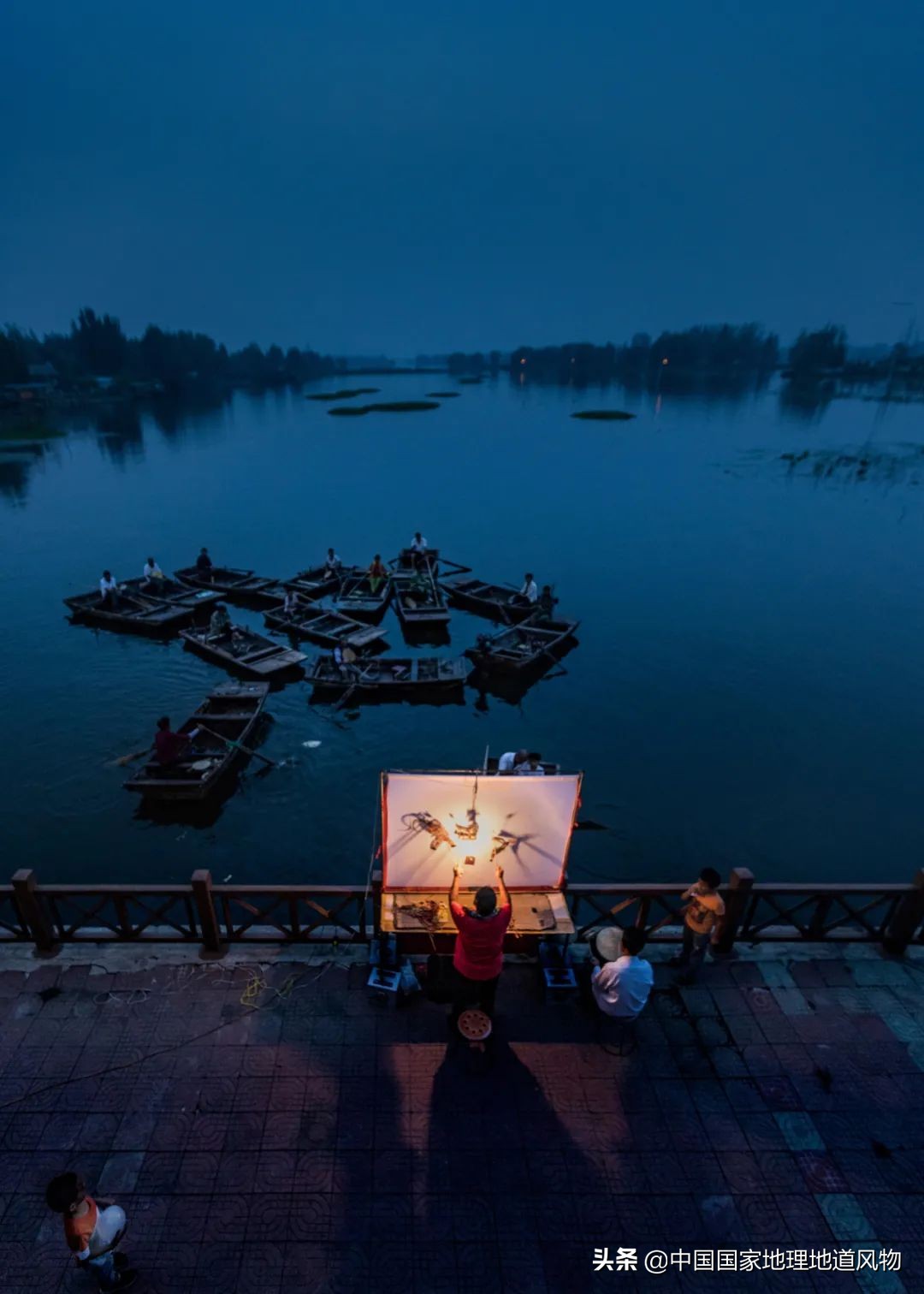 ▲ 鲁南皮影戏非遗传承人来在微山湖深处的渭水河畔表演皮影戏。图/视觉中国
