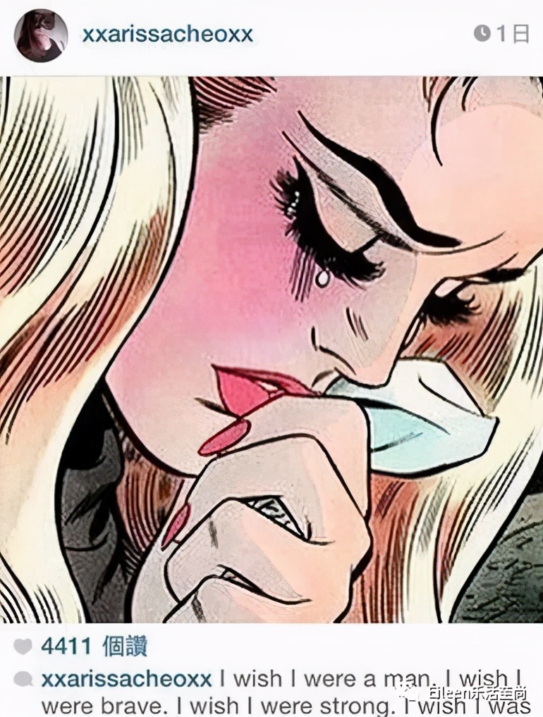 不到一个月,石贞善再次在ins上发了哭泣的女人脸艺术画,配文说希望自己是男人,希望自己勇敢强大。