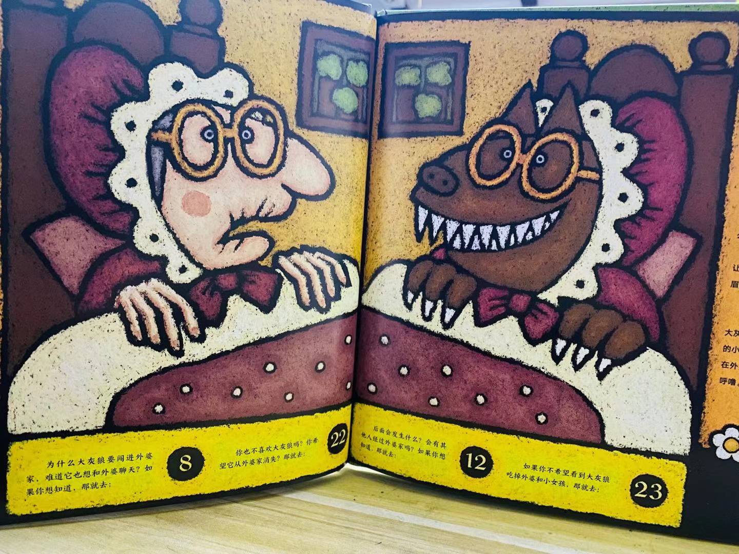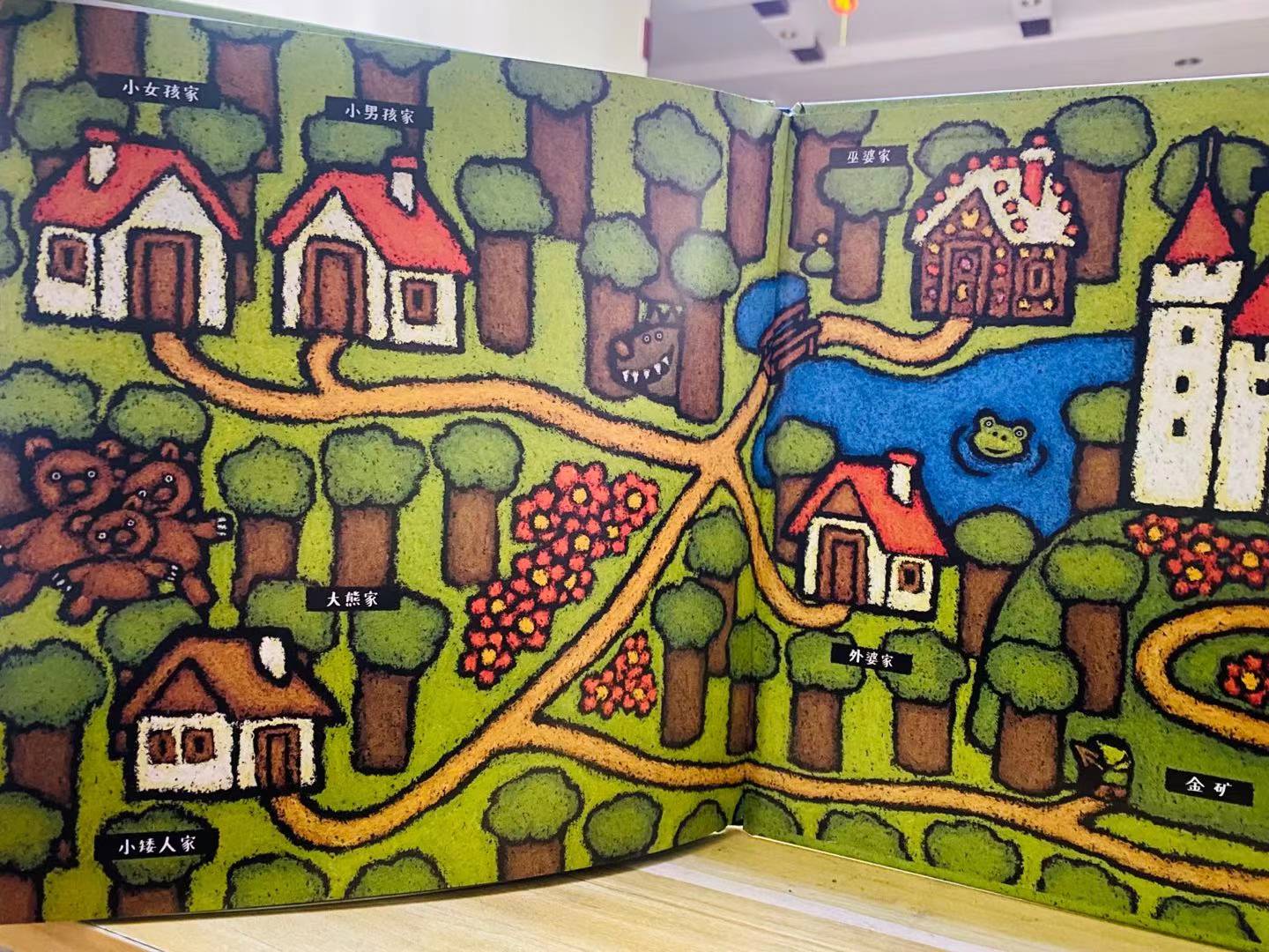 绘本里有男孩、女孩、狼、小矮人、巫婆、城堡、森林、小熊……小男孩可能会遇到大灰狼,然后拯救了被大灰狼吃掉的女孩和外婆;男孩也可能变成一直癞蛤蟆,需要女孩的亲吻才能变成王子;男孩还有可以遇到从女巫手里逃脱的女孩……