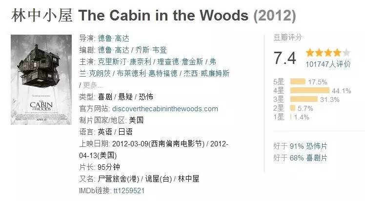 《林中小屋》豆瓣评分7.4,被誉为恐怖片爱好者的一剂良药。影片中充斥着所有恐怖片中熟悉又烂俗的套路,却又完全不按套路出牌。