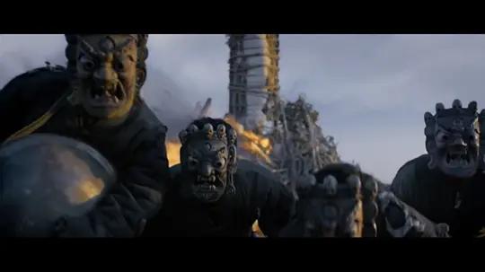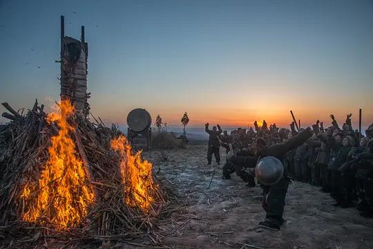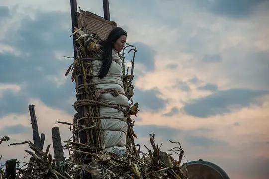 熊熊大火里,寡妇李忆莲像只蚕蛹被捆得死死的在火把中间,火堆前是几个带着面具跳舞的村民,
