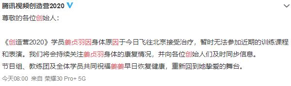 #娱乐圈这点事#6月3日上午,《创造营2020》官方账号在社交平台发布公告,表示学员姜贞羽因为身体原因需要飞到北京治疗,暂时无法参加近期的训练课程和表演,希望大家理解。