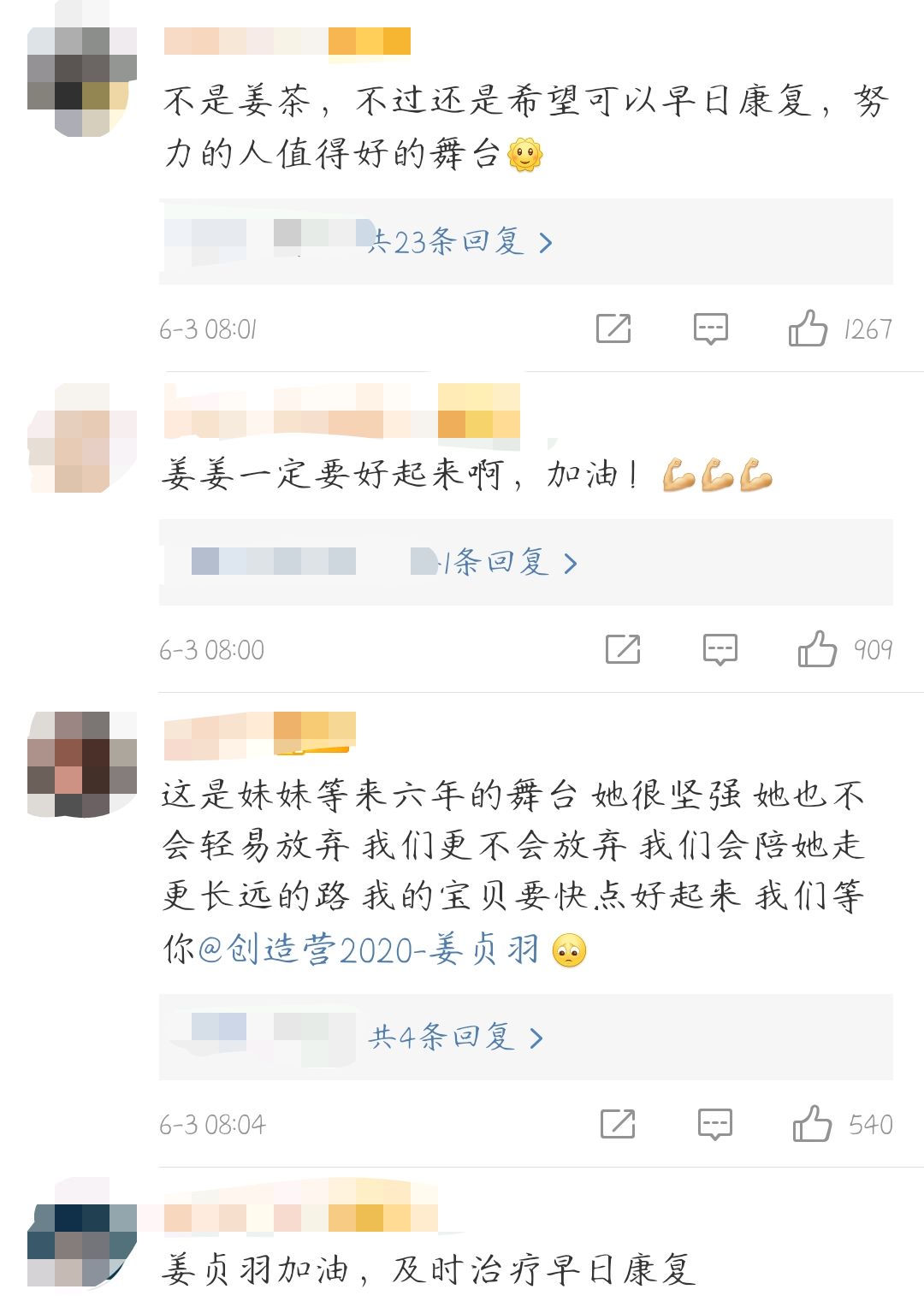 消息爆出之后,网友纷纷为姜贞羽送上了祝福,留言道:"不是姜茶,不过还是希望可以早日康复,努力的人值得好的舞台"、"姜姜一定要好起来啊,加油"、"这是妹妹等来六年的舞台,她很坚强,她也不会轻易放弃,我们更不会放弃"等等。