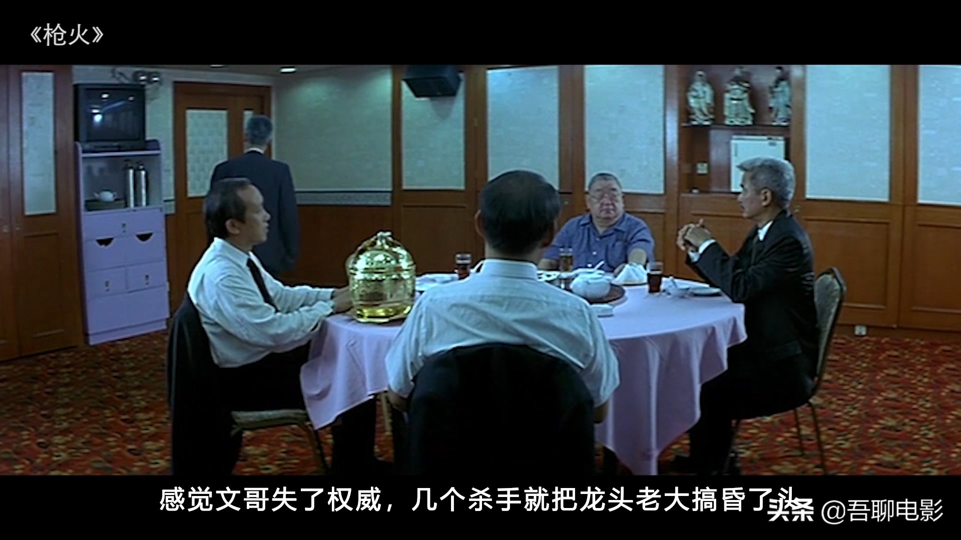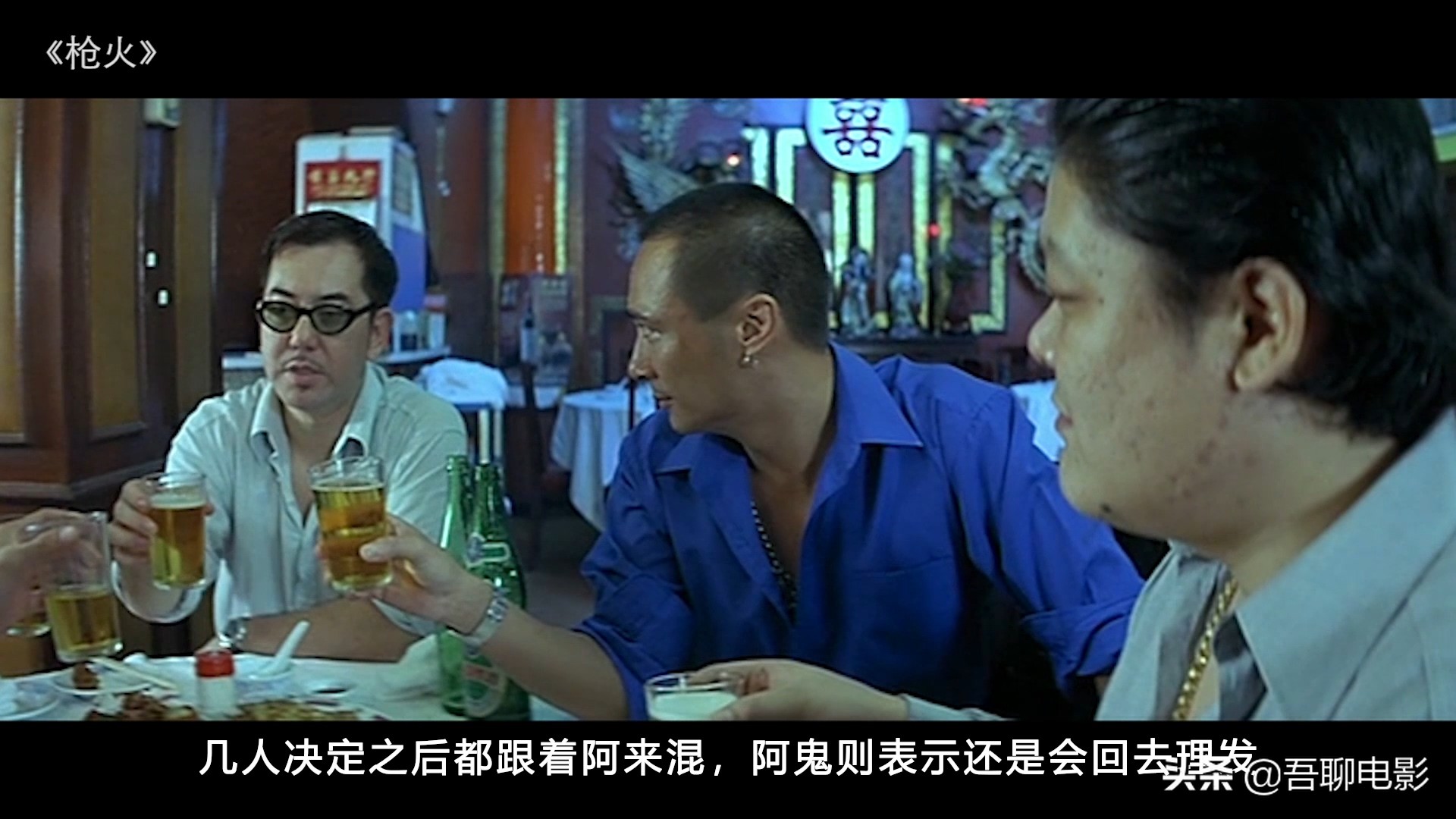 这里要说明一下,他们5人并不全互相认识,阿肥和阿鬼属于社团元老级别的,他们两个互相认识,而阿来和阿信是属于新起之秀,阿来(吴镇宇)是阿信(令狐冲)的老大,最后过来的是mike(乌鸦),他也是元老级的。