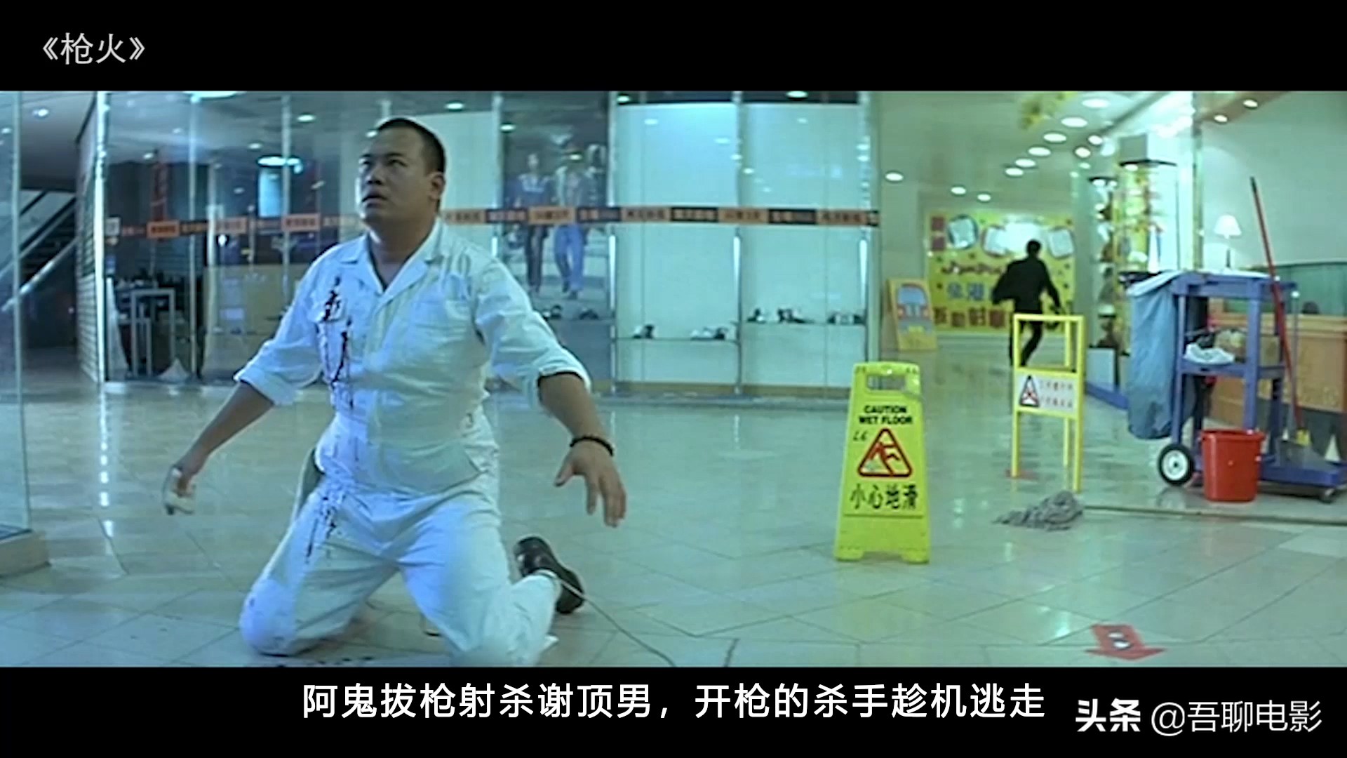 开完会,文哥离开,阿鬼等人如影随形,此时商场内已经开始关灯,5人前后护送下电梯,平行的对面有一个保安,忽然保安有动作,保镖5人组瞬间掏枪,连续射杀击毙杀手。