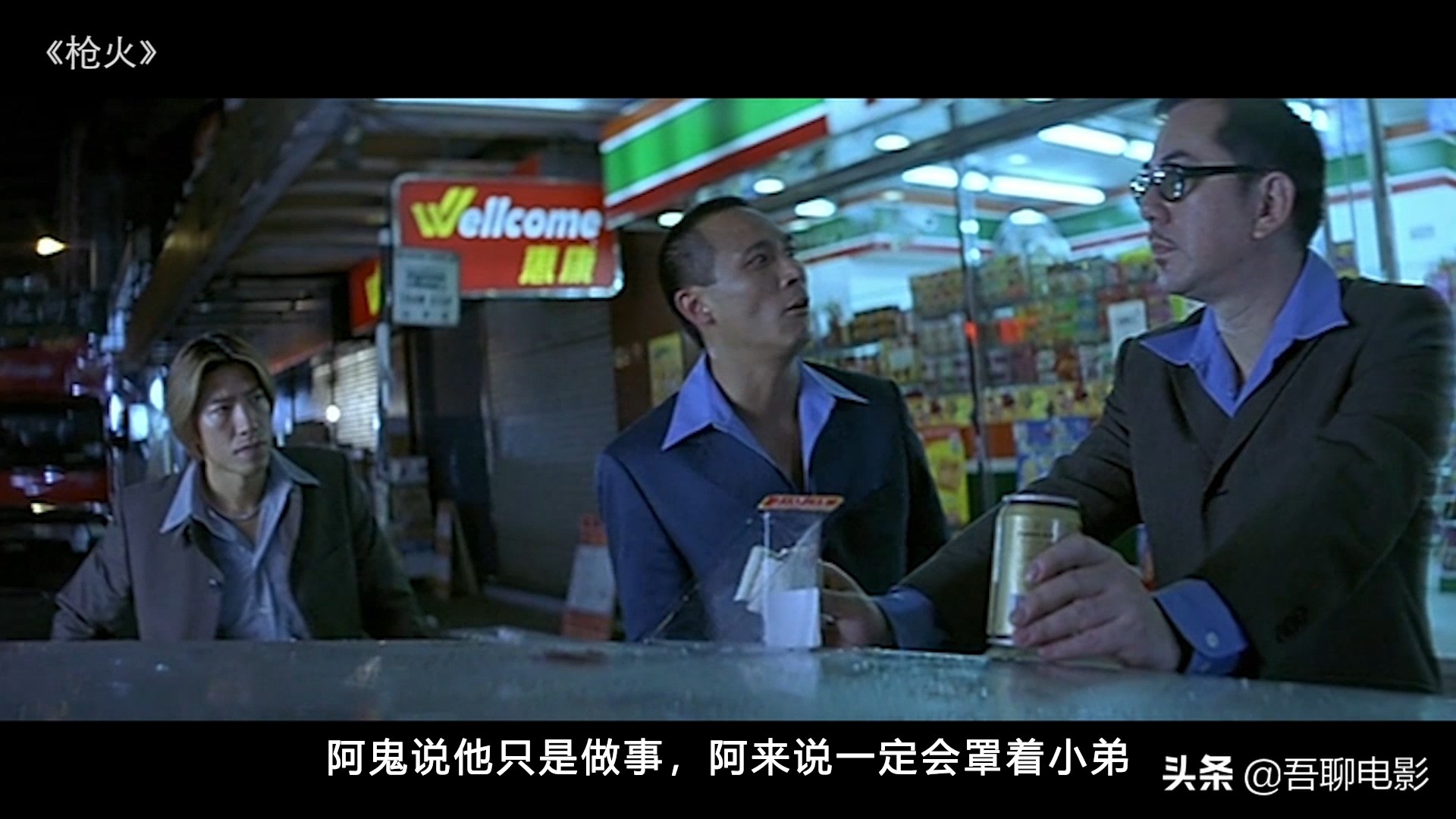 阿肥继续走,最后路过一家酒吧,在这里出现的是阿来(吴镇宇),昨天他伤了别人几根手指,警察来要人,阿来依然十分嚣张,后面出来的"令狐冲"是阿来的小弟,在这他叫阿信。