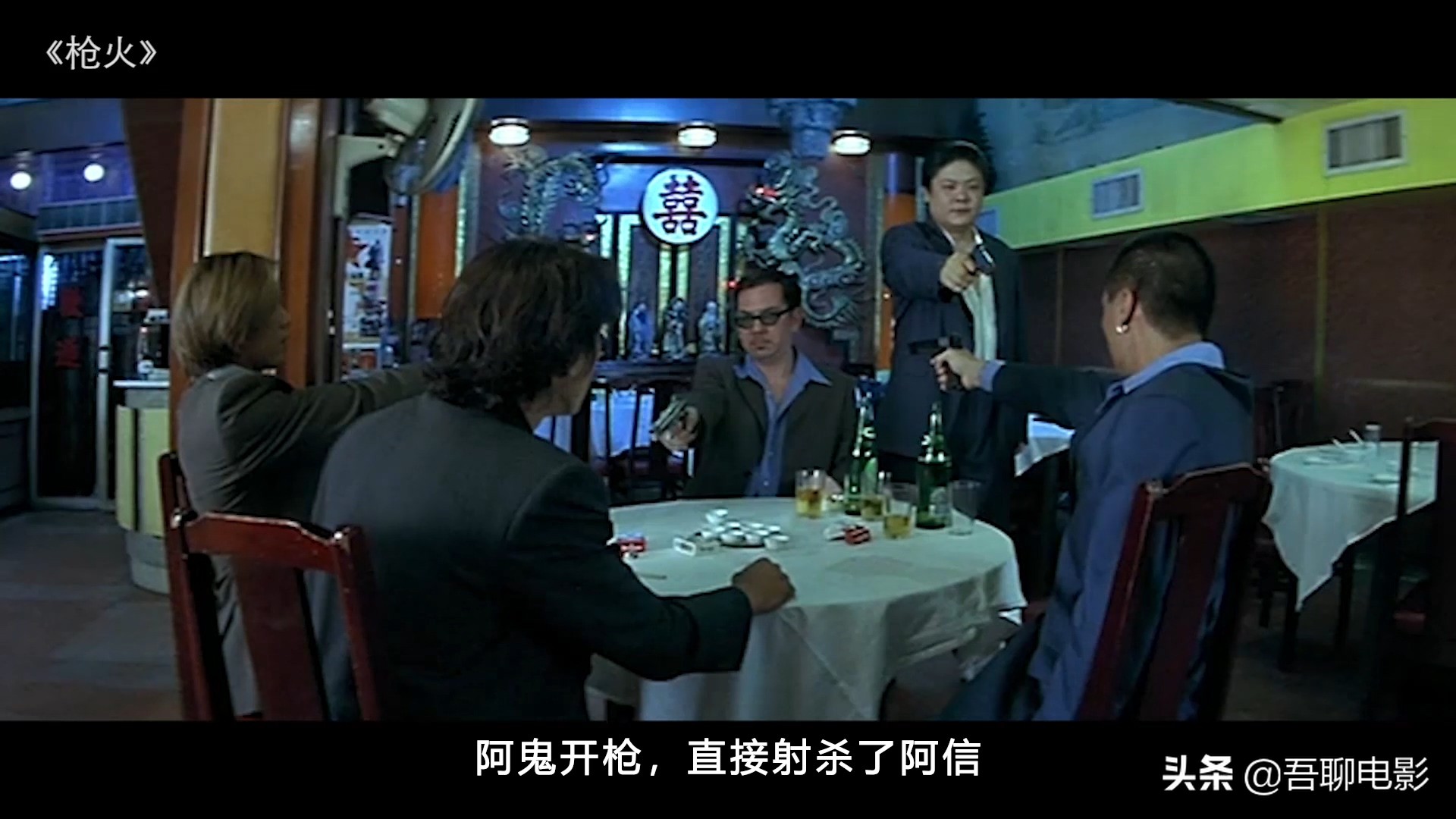 5人组这边等的不耐烦,阿来还给杀手点了根烟,阿鬼接到指令,拔枪把杀手击毙,保护老大的任务完成,可是电影的高潮还没有结束。