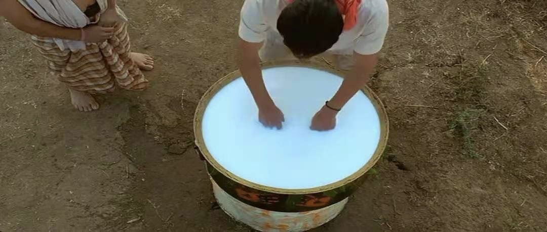 下一秒,场景一换,我们看见这个年轻的父亲把女儿按进了一大盆牛奶中,直到孩子没有了呼吸才拿出来。