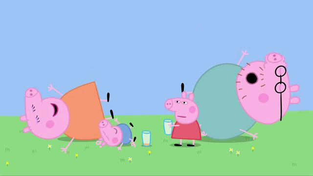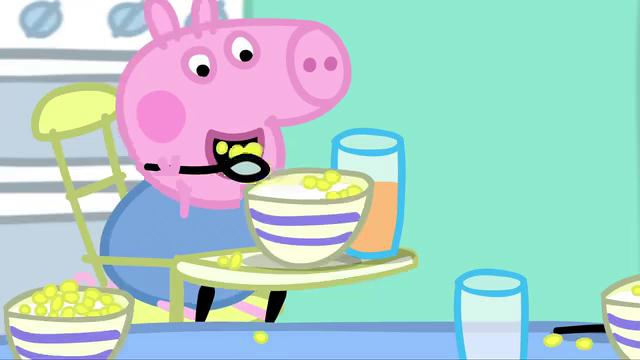 佩奇吃得很快,乔治也吃得很快,但是由于乔治喝果汁的时候太快了,于是打嗝了。【猪爸爸和猪妈妈并没有因为乔治打嗝阻止孩子出去玩】