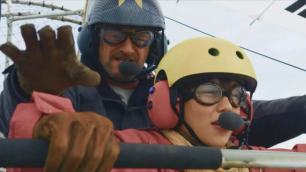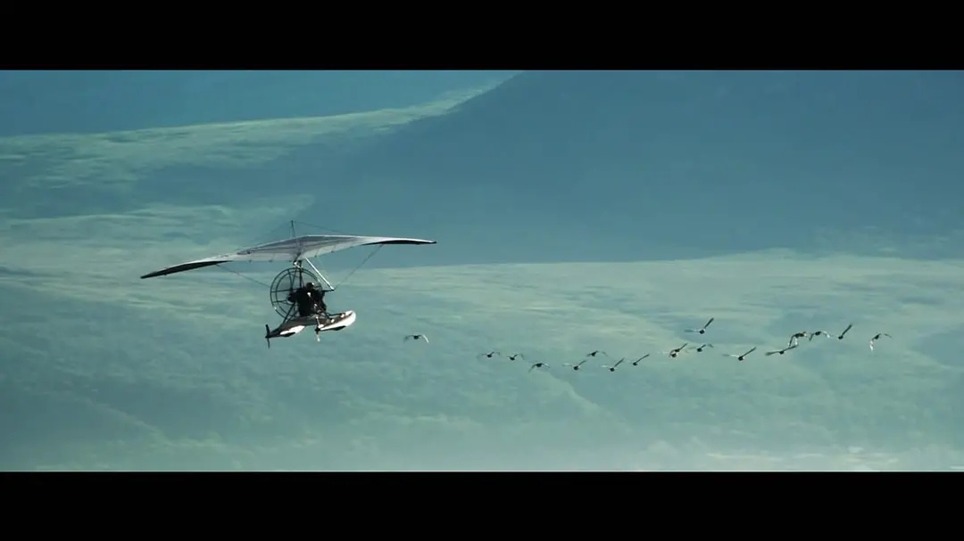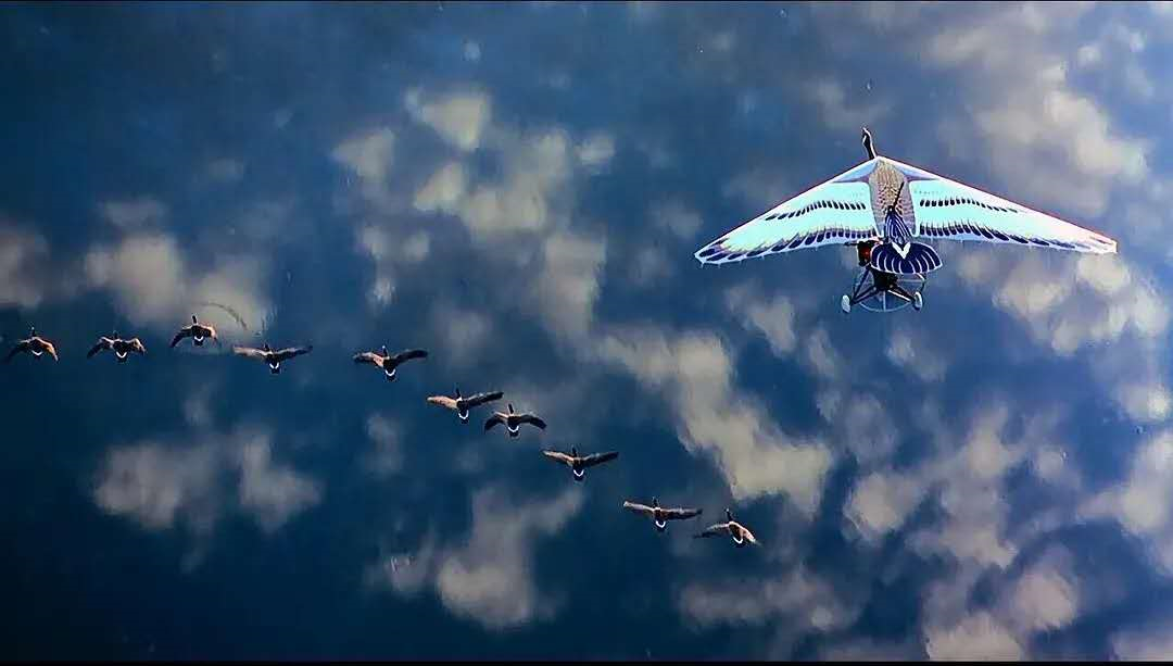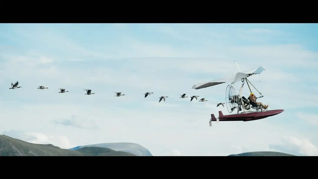 穹顶之下,开着飞机的托马在手机导航的带领下与一群大雁一同翱翔,他甚至伸出手可以触摸到正在飞行的白额雁们。
