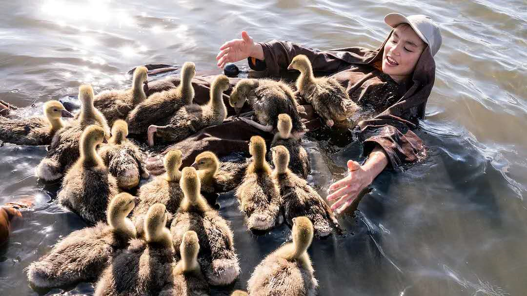 无论她走到哪里,16只大雁就会跟到哪里。