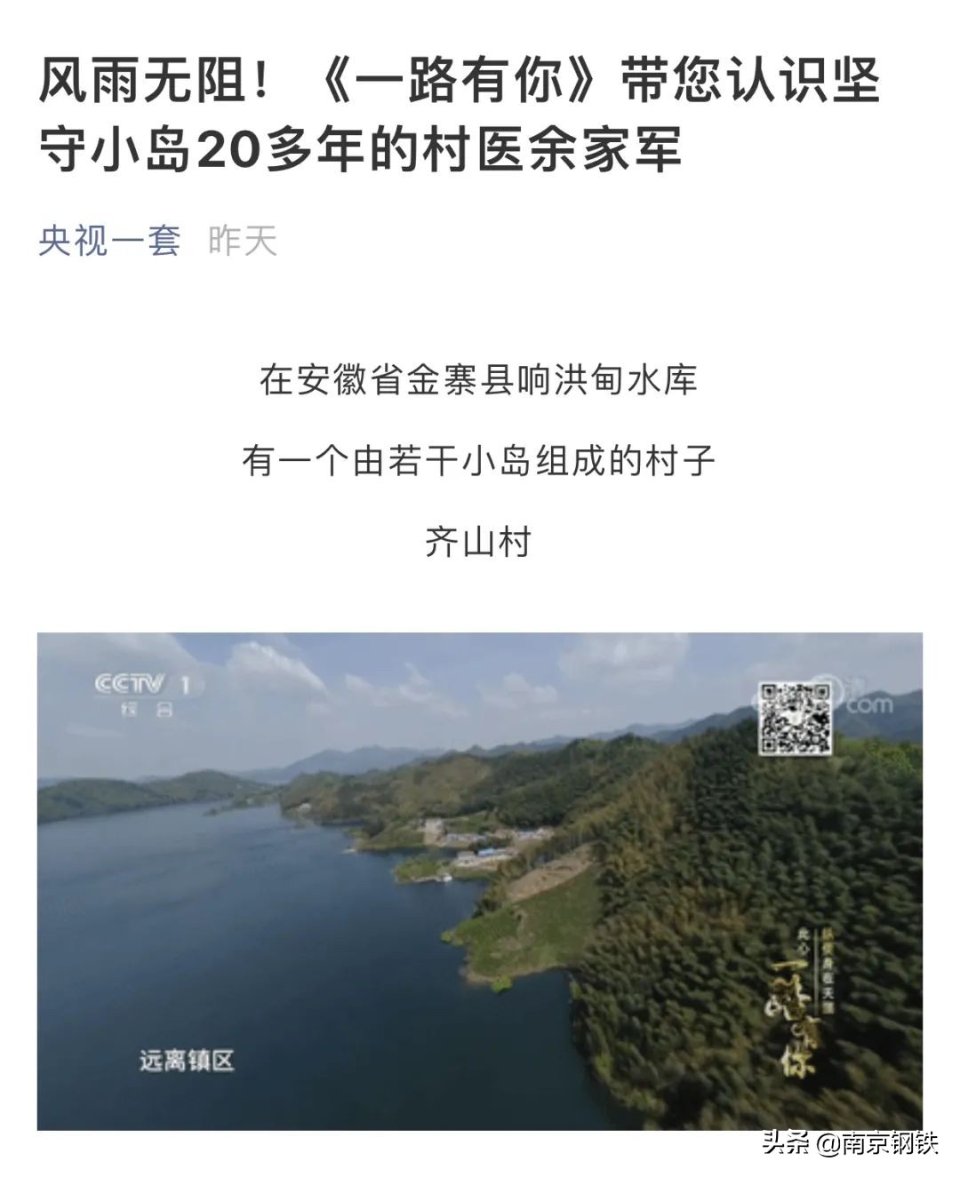 8月16日,“央视一套”微信公众号发布:cctv1频道《一路有你》栏目播出的《纵使身在天涯,此心一路有你》,专题介绍南钢党委书记、董事长黄一新在“健康暖心——乡村医生健康扶贫项目”对口帮扶的安徽金寨乡村医生余家军。