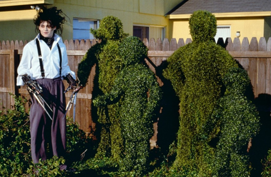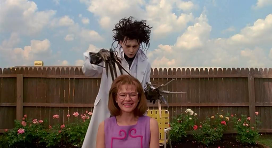 影片中最为纯洁和单纯的心灵,属于有着病态外形的爱德华,他双手挥舞间,所剪出一个个充满童趣和天马星空般想象的造型,都是他心灵的投影。