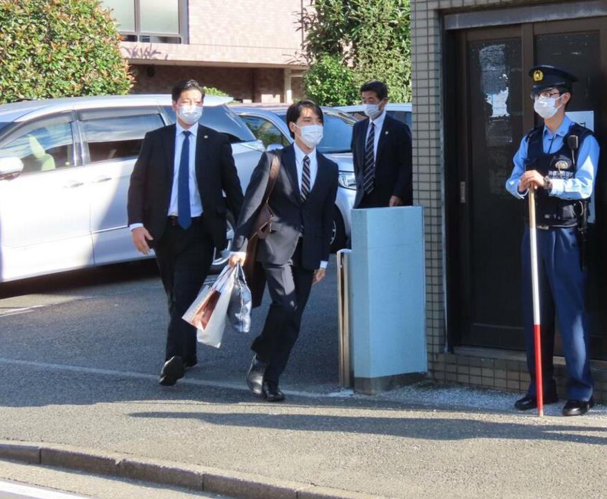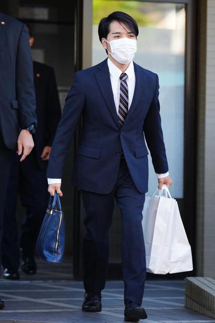 当天小室一身藏青色暗条纹西装内搭白色衬衫、系着斜纹领带、皮鞋锃亮,正装造型规矩得体。小室一手提着皮包一手拎着两个白色纸袋,沉甸甸的纸袋十分抢镜,似乎是为岳父母准备的见面礼。看来小室做足了功夫,很是细心礼数周到。