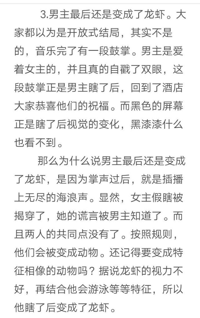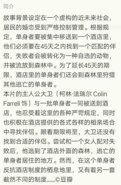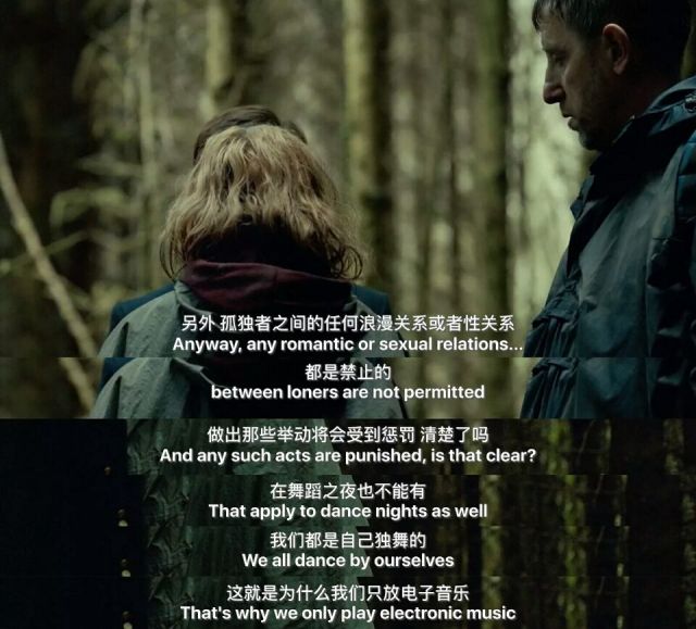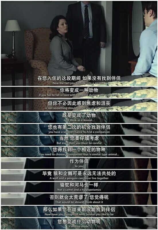 有评价说电影属于黑色幽默,而南北看到的更多是沉闷与压抑,毫无幽默。每个人的界限画的都如此之清,酒店里强调每个人必须拥有伴侣,每日洗脑式的强调拥有伴侣的优越性。恋爱的对象也一丝不苟的强调要有完全一致的共同点。每个人的爱情必须是完美的,乌托邦到让人无法理解。