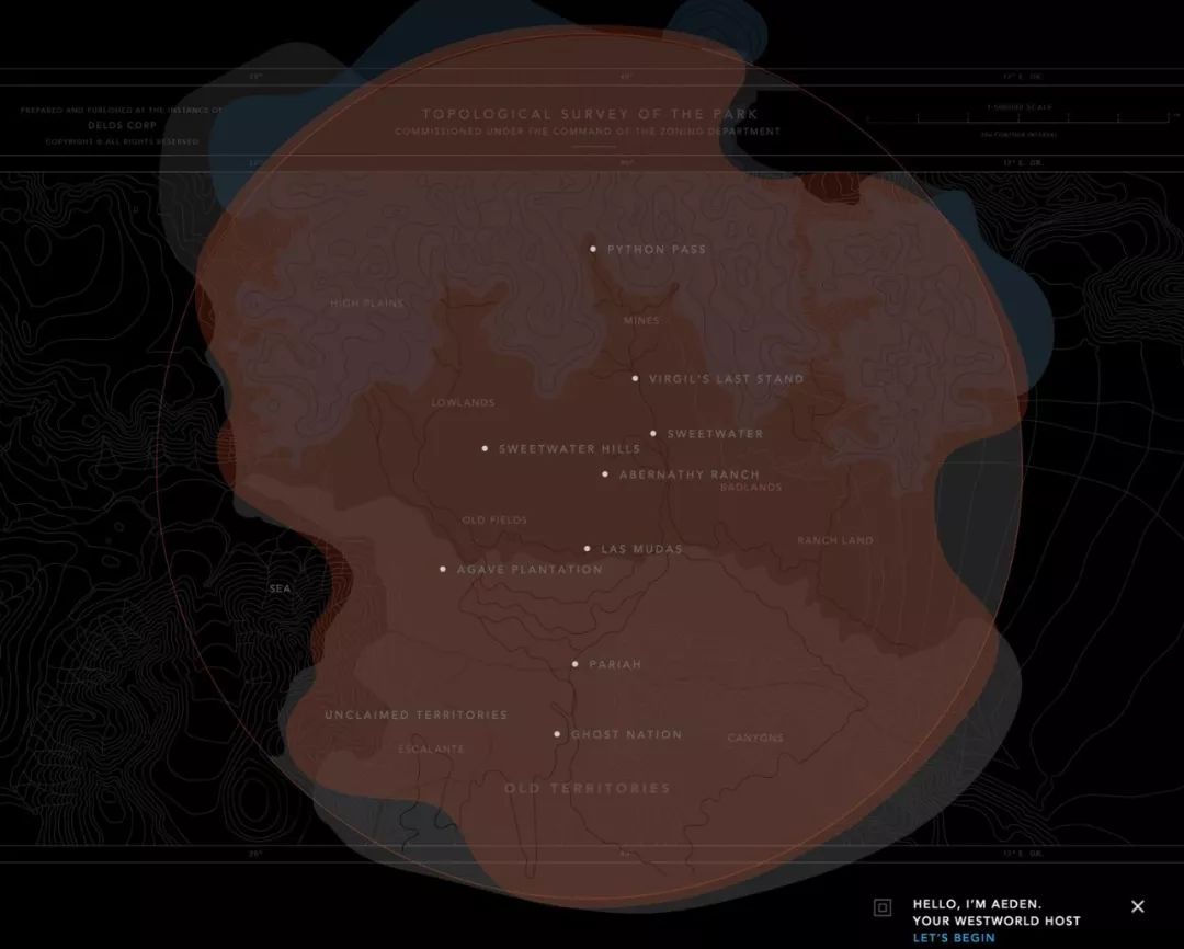 网站尾端还有一个西部世界的地图,呈红色警戒状态。从地图可以看出,第一季的西部世界,并没有全部呈现太多区域,第二季应该会全面开启。
