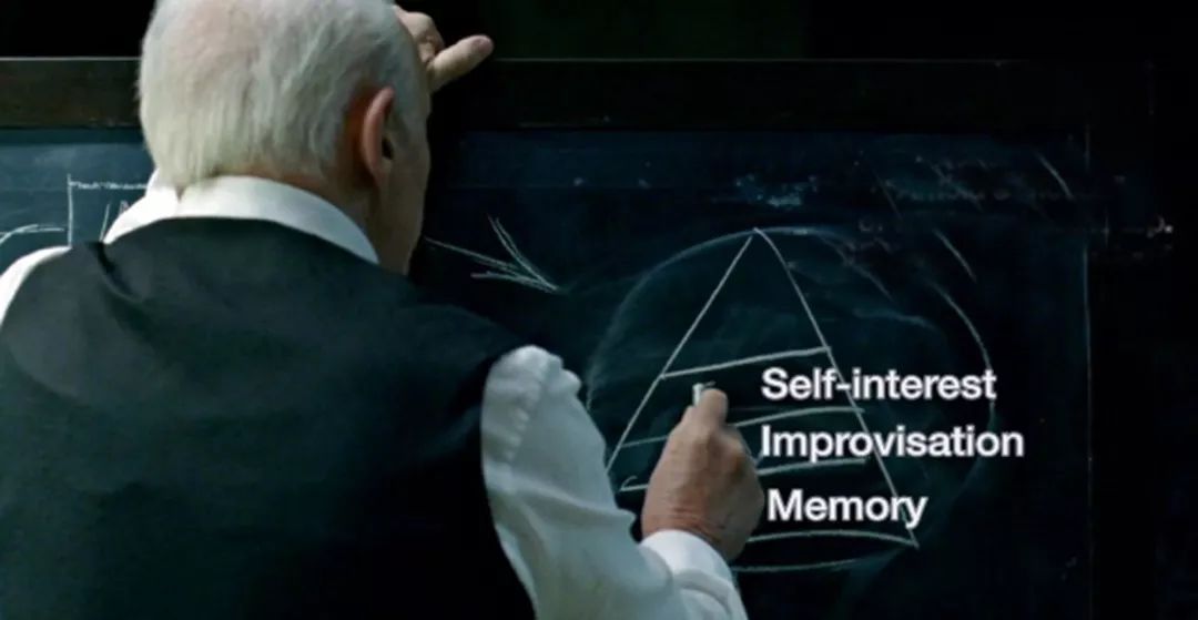 而最后一集阿诺德在三十多年前画的金字塔,第三层最顶层是空白,第二层写的是字母i,也就是improvisation(即兴发挥),按照这个逻辑,阿诺德的顶层应该就是利己意识+空白意识。