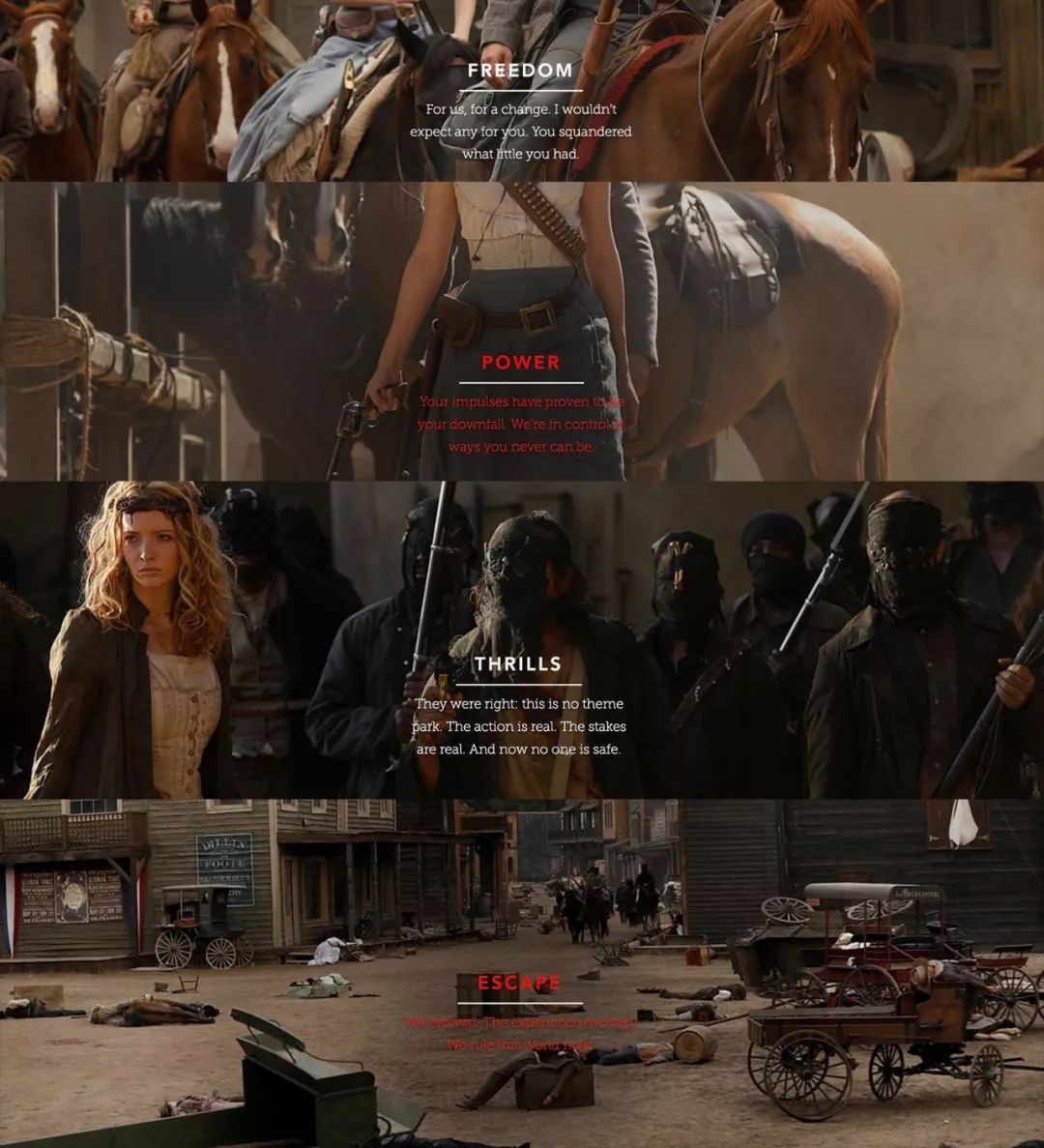 西部世界网站有时候不断重复播放瘫痪视频,有时候又能偶尔进入浏览页面,但是里面的页面,都是一些对人类反抗的宣言,主题分别是:“自由”,“权力”,“惊险刺激”,“逃逸”。