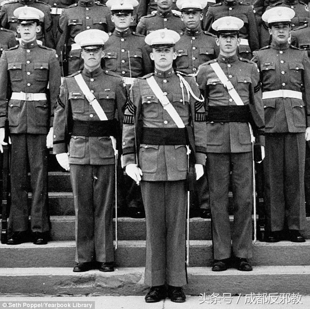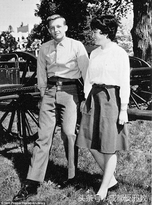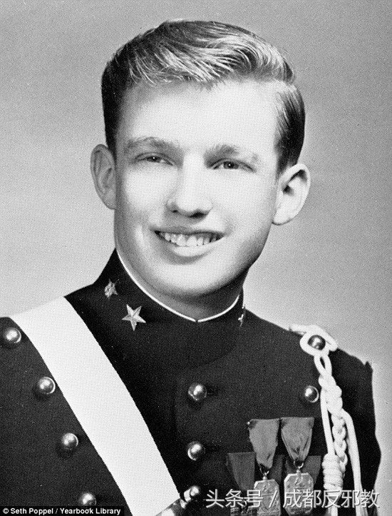 生在富家的特朗普十三岁就离开父母,面对军事学院的严格管理,穿军服,听口令,过着军营一般的集体生活。在家的时候吃的是专职厨师做的牛排,在学校吃的却是大食堂。在家里有自己专用的洗手间,在学校却是跟同学一起冲淋浴。在家里的时间可以自己安排,在学校却是刷牙、洗脸、叠被子、擦皮鞋、上操、做作业,都得遵守固定的作息时间表。图为1964年,就读于纽约军事学校的特朗普与一位女子合影。有人认为这是他的女朋友。