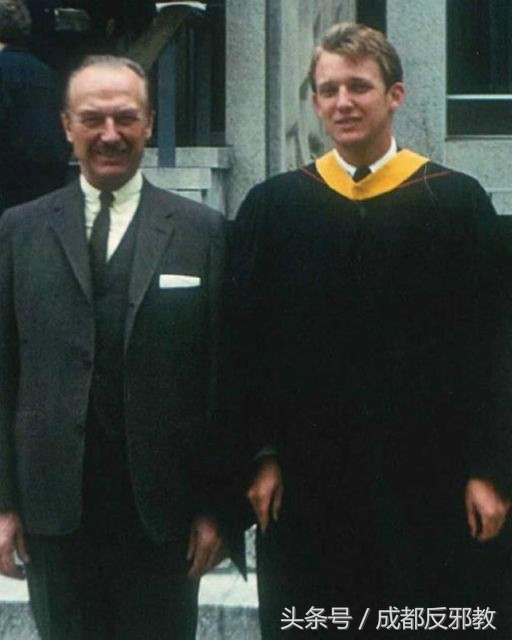 特朗普个头比同龄的孩子高,有几分体育天分,也有着争强好胜的性格,倒是适应军事学院的教育方式,成绩大有改进,多次受到嘉奖,到高年级的时候还当上学生干部。图为1964年,特朗普从宾州大学沃顿商学院毕业时与父亲合影。