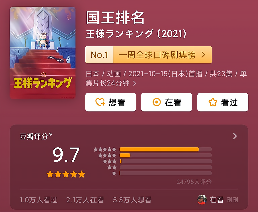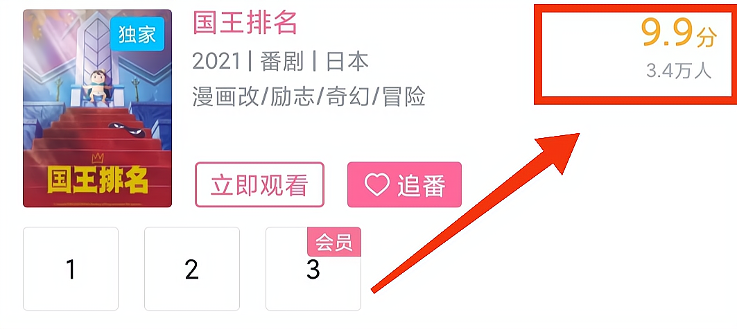 而《国王排名》动画上线后 ,仅在三话内容播出后,就有着高达9.9的评分,某瓣也有着9.7高评。